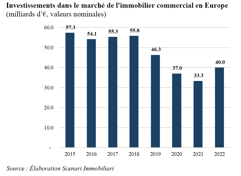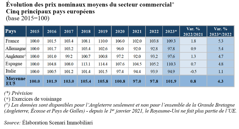 Les cotations, au cours de l’année 2022, semblent avoir enfin inversé la tendance négative enregistrée au cours de la période biennale 2020-2021. Les valeurs de vente et les loyers – comme le montre le Rapport 2023 sur le marché de l’immobilier commercial de Scenari Immobiliari – ont affiché, dans les principaux pays de l’UE, une augmentation moyenne de près de 1 % qui devrait être suivie d’une nouvelle hausse de plus de 4 % au cours de cette année. Cette croissance est principalement attribuable au rétablissement des niveaux prépandémiques par la fréquentation des centres commerciaux, au rapprochement rapide (et dans certains cas au dépassement) du nombre d’arrivées de touristes enregistrées au cours de 2019 dans les principales villes du continent, ainsi qu’au processus de rééquilibrage entre les achats en ligne et les achats dans les points de vente physiques.