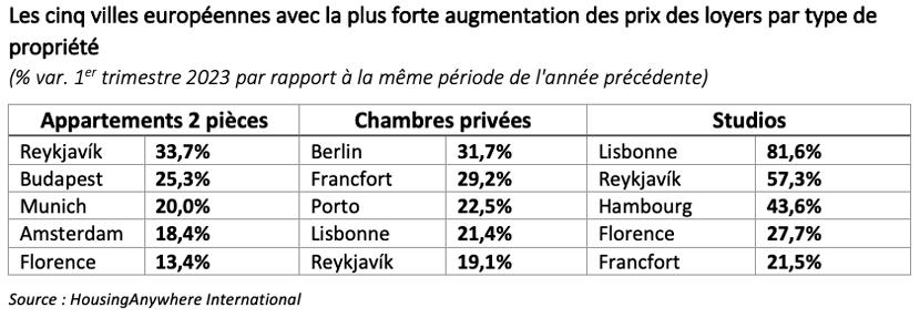 Les prix de location des studios à Lisbonne ont augmenté de 51,4 % au premier trimestre 2023, ce qui en fait la ville où les prix des studios ont le plus augmenté dans l’indice des loyers. Les villes néerlandaises et allemandes sont également en hausse, Rotterdam dépassant Amsterdam en matière d’augmentation pour les studios au dernier trimestre 2022 avec +10,5 % et La Haye avec pas moins de +31,6 %. À Berlin, les studios ont subi une hausse de 12,7 %, tandis qu’à Hambourg, les prix des appartements ont augmenté de 11,1%. Florence est la ville italienne qui enregistre les plus fortes hausses tous biens immobiliers confondus et les prix des appartements deux pièces, notamment, ont augmenté de 13,5 %.
