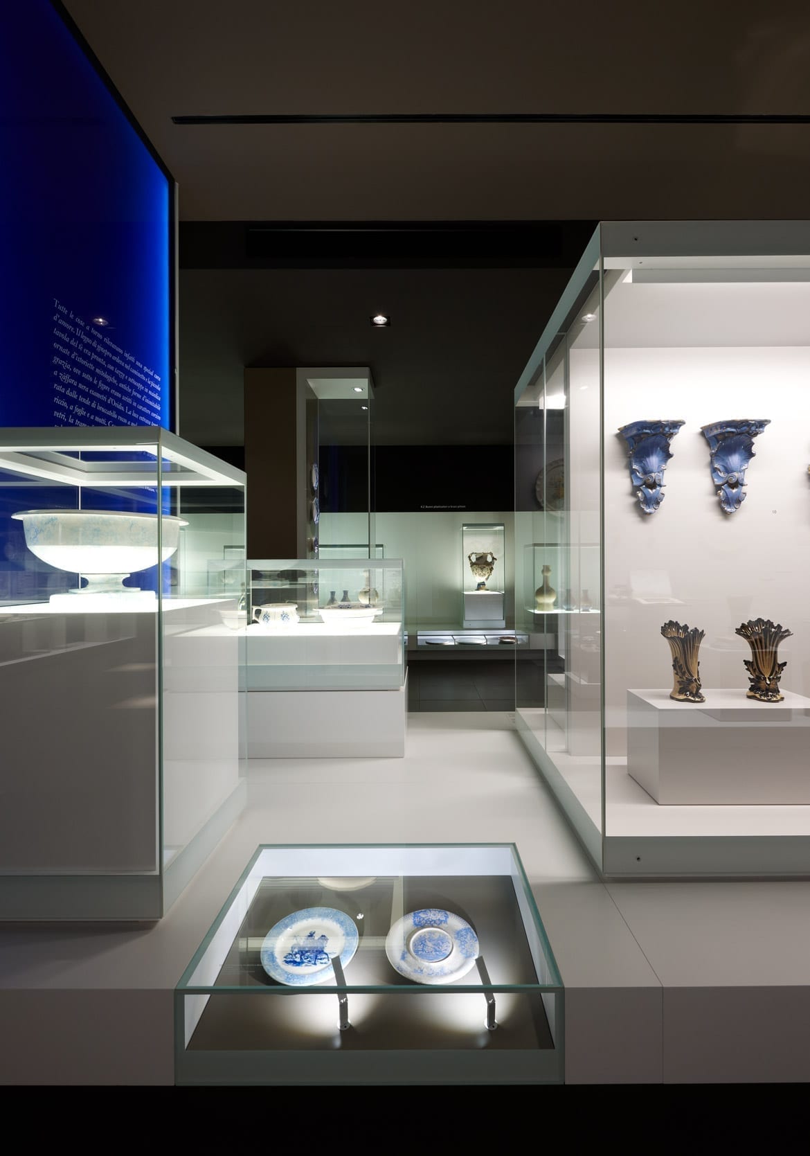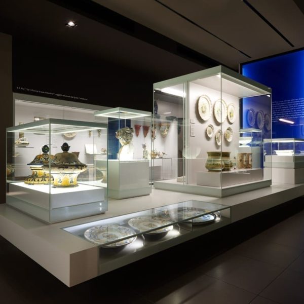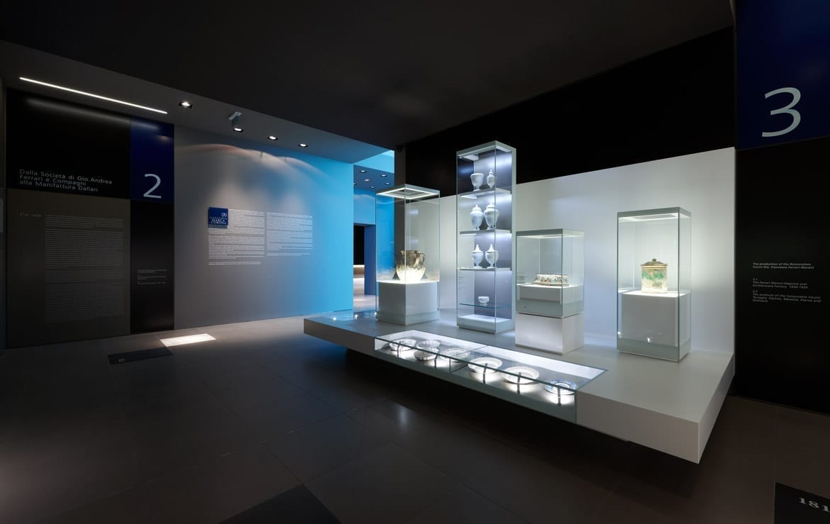 Le parcours chronologique de l’exposition part des objets ‘archéologiques’ pour présenter au visiteur l’évolution technologique qui sous-tend l’histoire du matériau. Une évolution qui pourrait s’appeler révolution lorsqu’au XXVIIIe siècle la terre cuite peinte laisse place à la véritable faïence. La bourgeoisie devient alors exigeante, réclame une production de plus en plus élevée et trouve satisfaction dans un groupe de particuliers visionnaires qui forment les ouvriers locaux, exploitant également les compétences d’artisans étrangers venus de Pesaro, de Lodi, de Livourne et de France. Le but est de limiter le plus possible les importations pour ne pas exporter de monnaie précieuse.