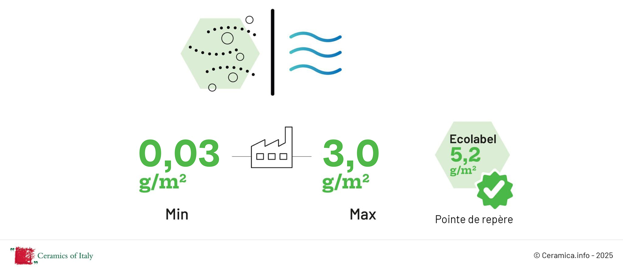 Le fluor est l’un des polluants typiques émis par les fours industriels. La quantité rejetée par la cuisson de la céramique varie de 180 à 340 kg/an, selon les dimensions des installations. Néanmoins, grâce à l’installation de systèmes d’épuration des poussières et des fumées à chaud, les émissions de fluor provenant des cycles de production de la céramique italienne sont rigoureusement contrôlées et maintenues en dessous de la limite légale de 0,2 g/m², condition nécessaire pour obtenir l’écolabel.