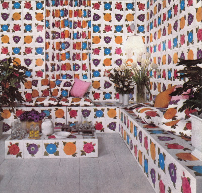 Deux décors avec des carreaux céramiques de créateurs de mode : à gauche Ken Scott pour Cedit (1976), à droite Valentino pour Ceramiche Piemme (1981)