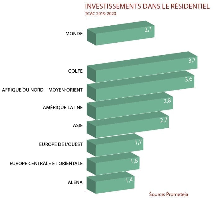 Sur les nouveaux marchés, la zone du Golfe (3,7%) et l’Afrique du Nord – Moyen-Orient (3,6%) devraient afficher les taux de croissance les plus élevés, tandis que l’Extrême-Orient devrait connaître une évolution plus contenue (2,7%). Dans cette zone, l’Inde, l’Indonésie et d’autres économies d’Asie du Sud-Est continueront d’afficher les meilleures performances, ce qui compensera en partie le ralentissement attendu dans l’industrie du bâtiment en Chine. On exclut toutefois la possibilité d’une correction brutale du secteur résidentiel chinois, parce que la forte croissance des revenus des ménages et le processus d’urbanisation en cours continueront à soutenir la demande de logements. En Amérique latine, les investissements devraient revenir en territoire positif, sous l’effet de l’inversion de tendance du marché brésilien, tandis que l’Europe centrale et orientale devrait ralentir, souffrant de la baisse de la construction en Turquie, où tous les secteurs, et en particulier celui du résidentiel, subiront l’impact de la crise financière. Le ralentissement pourrait être en partie atténué par des signes plus évidents de reprise pour l’industrie russe de la construction.