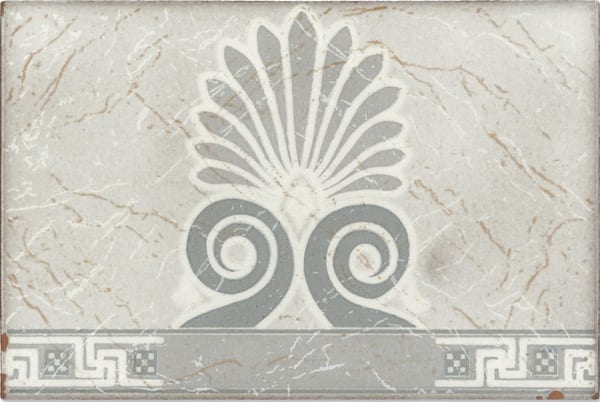 (Photo ci-dessous: Olimpia, série Marmi, carreau produit par Cerdisa, Fiorano Modenese (Modène). 1980, cottoforte émaillé, décoré en sérigraphie, 20×30 cm. Conservé au Centro di Documentazione dell’Industria italiana delle Piastrelle di Ceramica, à Sassuolo (Modène).