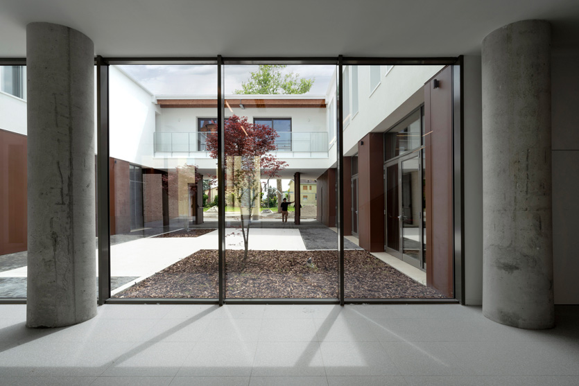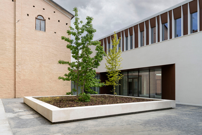 Le projet, malgré son échelle limitée (1000 m2), est un véritable projet urbain, capable de dialoguer profondément avec le contexte historique. L’intervention se développe à travers une séquence de cours qui organisent les espaces et renforcent les connexions entre la rue et le parc intérieur. Ce système renforce le rôle symbolique de l’église de San Rocco et de l’oratoire, en créant des lieux à forte identité et reconnaissables.