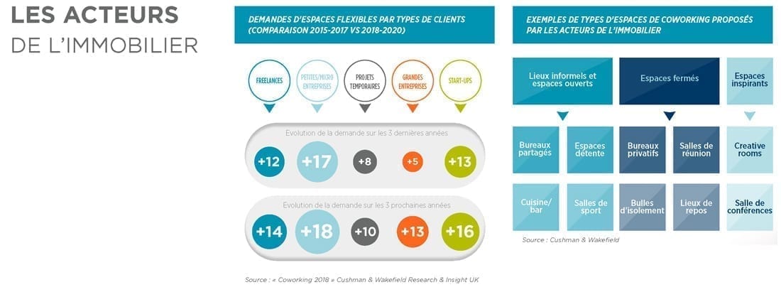 Mais le fait sans doute le plus significatif du potentiel de ce secteur est la présence massive de l’industrie immobilière. Investir dans des projets de coworking est devenu un choix de plus en plus stratégique pour les entreprises de ce secteur, des grands fonds d’investissement aux plus grandes chaînes hôtelières de France, qui pensent ainsi offrir un plus large éventail de services à leurs clients. Agnès Talène dit : « Les acteurs de l’immobilier ont le plus fort potentiel de développement quant à la possibilité de louer des espaces et d’attirer une clientèle plus vaste, dont les entreprises (des start-up aux grandes sociétés) pour satisfaire à leur besoin de trouver des espaces complémentaires temporaires et pour créer des zones de coworking dans leurs immeubles ».