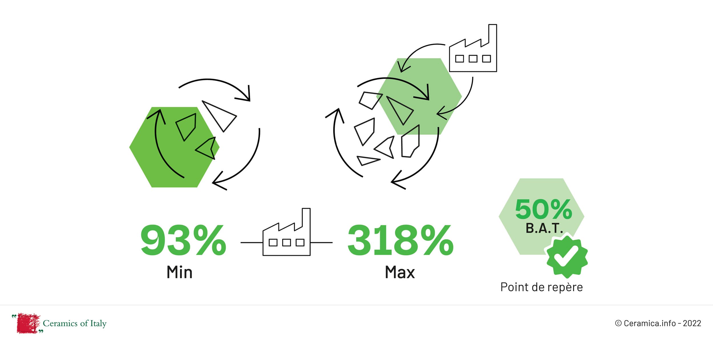 La céramique italienne dépasse largement les seuils minimaux des meilleures techniques disponibles (MTD) pour le traitement des déchets, émis par la Commission européenne en 2018. Les valeurs du facteur de recyclage des résidus vont d’un minimum de 93 % à un maximum de 318 %, dépassant largement la limite de 50 % requise par les MTD sectorielles.