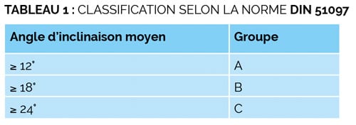 – pour les matériaux de revêtement de sol destinés à des environnements où l’on peut habituellement marcher pieds nus (saunas, piscines, etc.) : opérateur pieds nus sur une surface d’essai mouillée avec de l’eau + agent mouillant neutre. La norme de référence est la DIN 51097 qui définit 3 groupes de résistance à la glissance : A, B, C (Tableau 1).