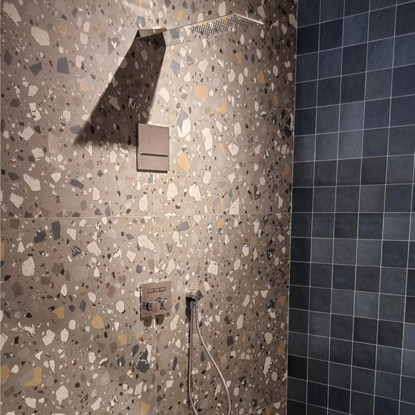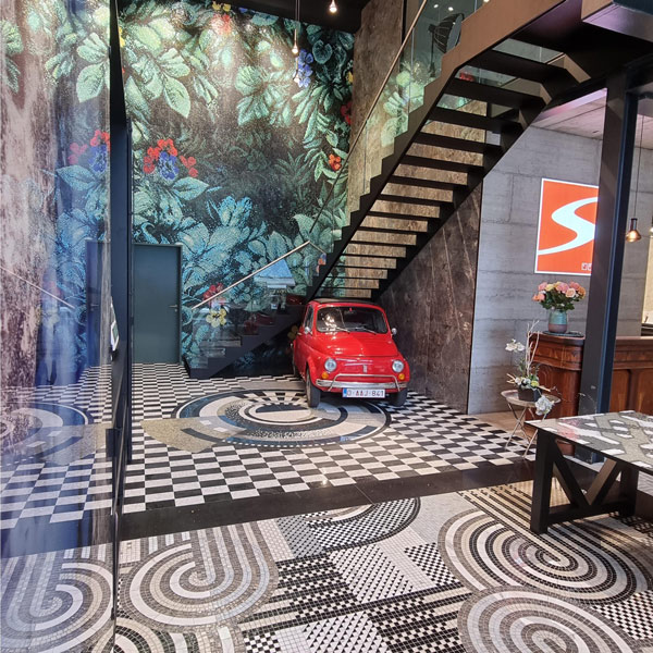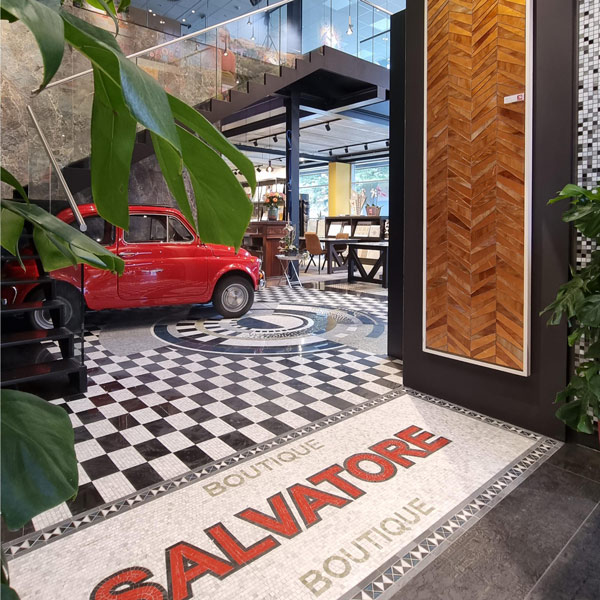 « C’est vrai. Mon père avait à peine seize ans lorsqu’il a quitté sa terre natale pour aller tenter sa chance en Belgique. C’était en 1963. Arrivé en Belgique, il se spécialise dans la pose de mosaïques, d’abord en tant que salarié, puis en indépendant. En quelques années, il fonde une famille et crée sa propre petite entreprise de carrelages dans la région de Bruxelles et pendant qu’il pose ses carrelages, ma mère Rosa les vend, de manière très modeste, car la vente a lieu dans le couloir de la maison. Puis en 1989, la première participation à Batibouw marque un tournant : l’entreprise ne parvient plus à satisfaire une demande qui croît très vite. Ainsi, en 1992, l’entreprise s’installe dans une salle d’exposition de plus de 1 000 m² et, plus de dix ans plus tard, un deuxième établissement ouvre à Rhode-Saint-Genèse, dans le Brabant flamand, entre Bruxelles et Waterloo. Et c’est l’actuelle showroom, qui réserve au visiteur de belles surprises : une partie de la salle d’exposition est occupée par des produits typiques siciliens (du vin, de l’huile d’olive, des pâtes…) l’autre grande passion de mon père. Il possède en effet des vignes en Sicile et il importe directement ses spécialités régionales en Belgique, sous la marque Alta Mente Natura. Il souffle ainsi dans la salle d’exposition une petite brise italienne ».