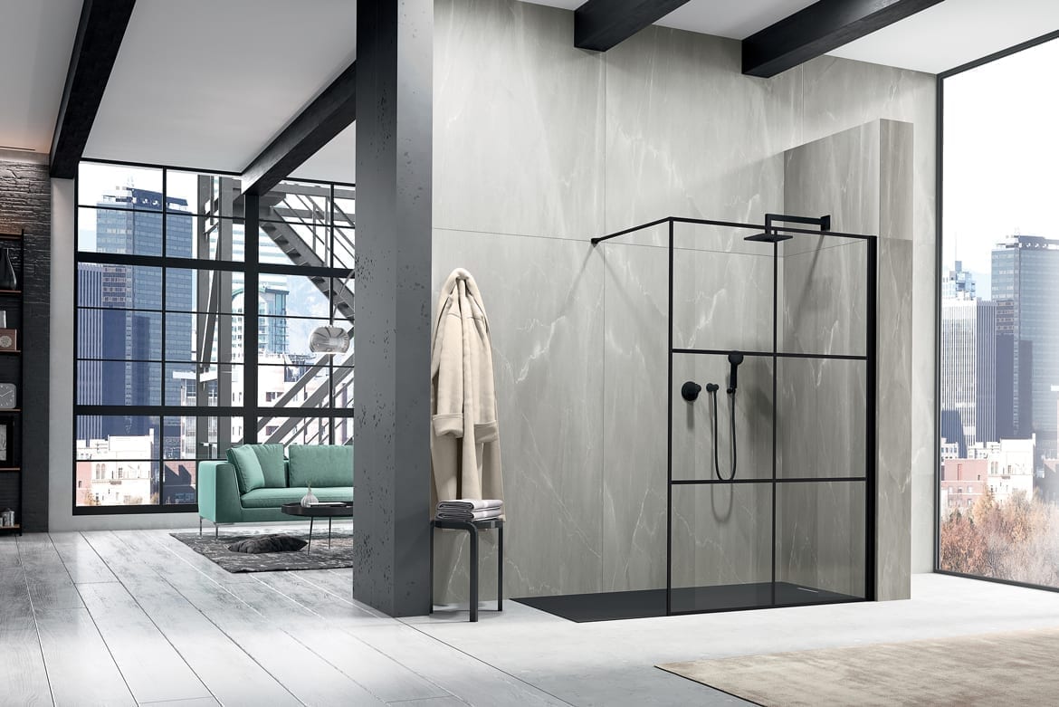 08. Duka propose une nouvelle finition pour la cabine de douche Libero 3000 caractérisée par une sérigraphie géométrique sur verre qui reproduit les châssis en fer forgé typiques des contextes industriels.