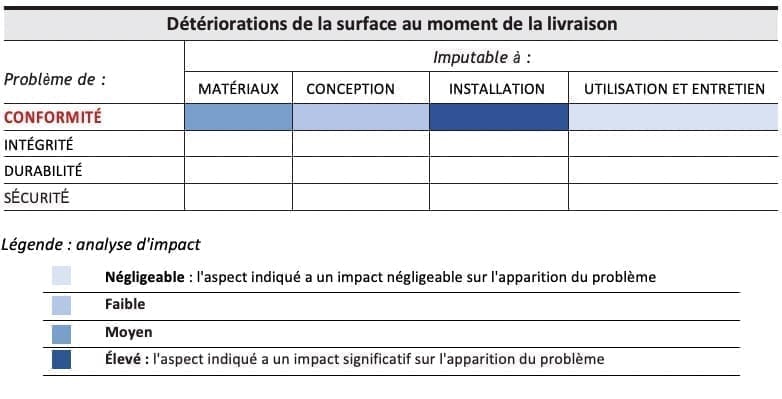 La destination du carrelage, le support et le schéma de pose jouent un rôle négligeable dans l’apparition des criticités mises en évidence. Il faut chercher les principales causes de ces problèmes dans les matériaux qui composent le carrelage, soit les carreaux, les joints et les mortiers liquides, ainsi que dans la pose et le nettoyage final du sol.