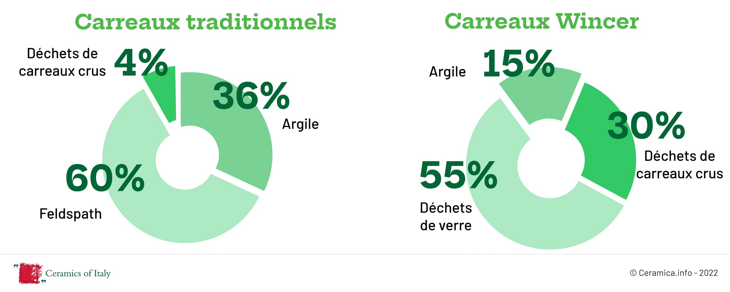 Les entreprises italiennes de céramique ont participé à de nombreuses initiatives de recherche de produits durables. Le projet européen WINCER (http://www.wincer-project.eu/) figure parmi ces initiatives. Coordonné par le Centro Ceramico, il vise à produire des carreaux avec des matériaux provenant de déchets urbains et industriels. Ce projet, qui s’est développé sur la période 2015-2018, a permis, grâce à la présence des entreprises partenaires, de produire industriellement les premiers carreaux avec 85 % de matières premières secondaires.
