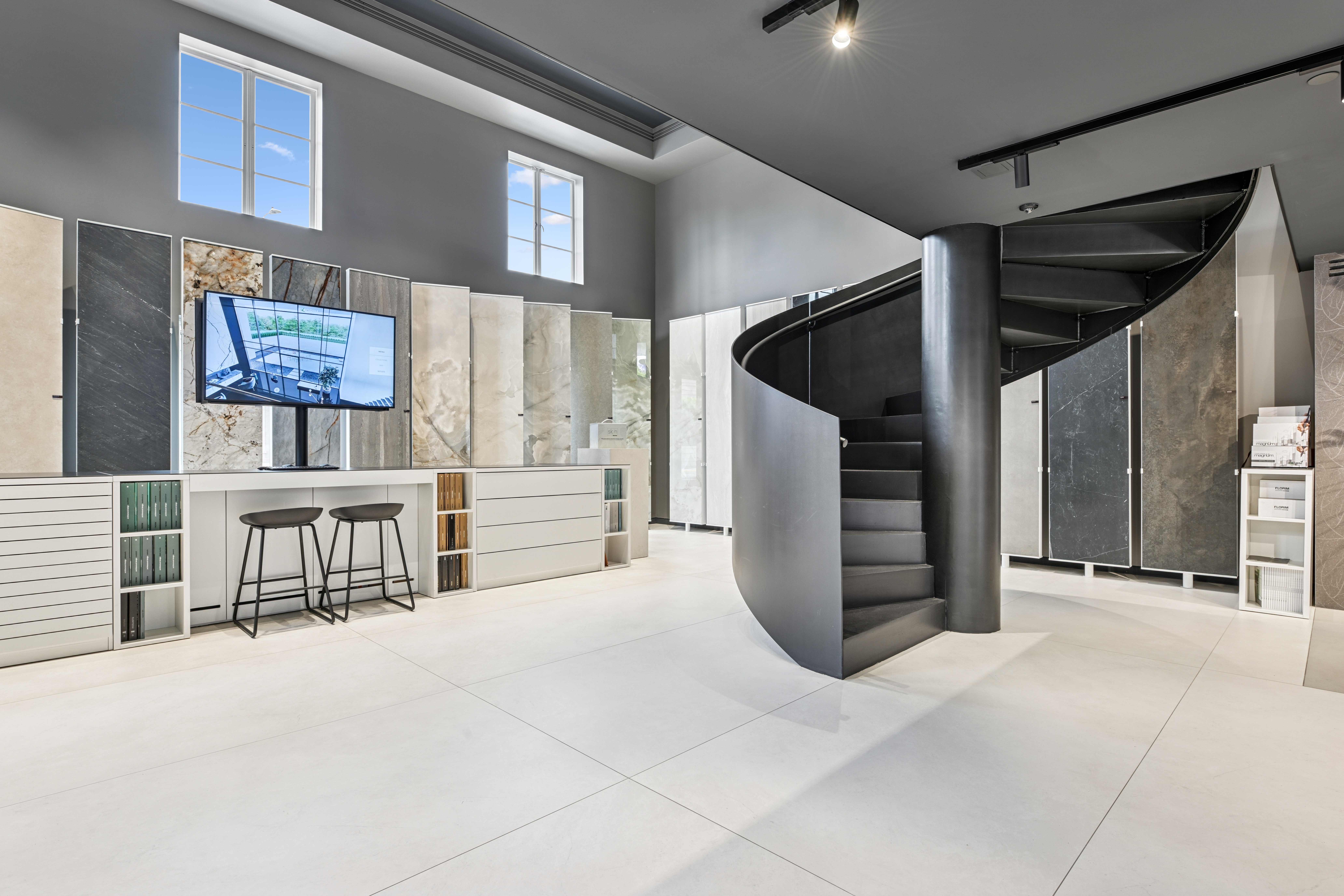Le showroom, doté de sept vitrines établissant un dialogue direct avec le tissu urbain de Robertson et Dorrington Boulevard, s’étend sur plus de 600 m² répartis sur trois niveaux, complétés par deux loggias et une terrasse panoramique. Le parcours d’exposition se déroule entre le premier et le deuxième étage, à travers une série d’ambiances explorant les multiples possibilités d’application des grandes dalles en céramique Florim.