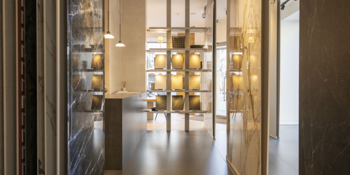 — imaginé par ACPV ARCHITECTS Antonio Citterio Patricia Viel — où grandes surfaces, textures, couleurs et collections racontent une céramique réinterprétée avec sophistication et profondeur matérielle.