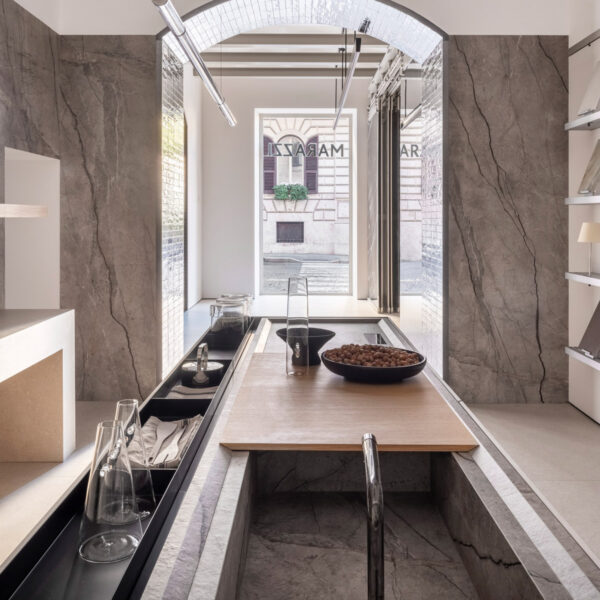 Une succession de salles thématiques met en valeur la préciosité des matériaux Marazzi, qui, exposés dans des espaces dynamiques et interconnectés, dialoguent avec l’architecture pour créer un flux visuel qui invite les visiteurs à explorer chaque détail.
