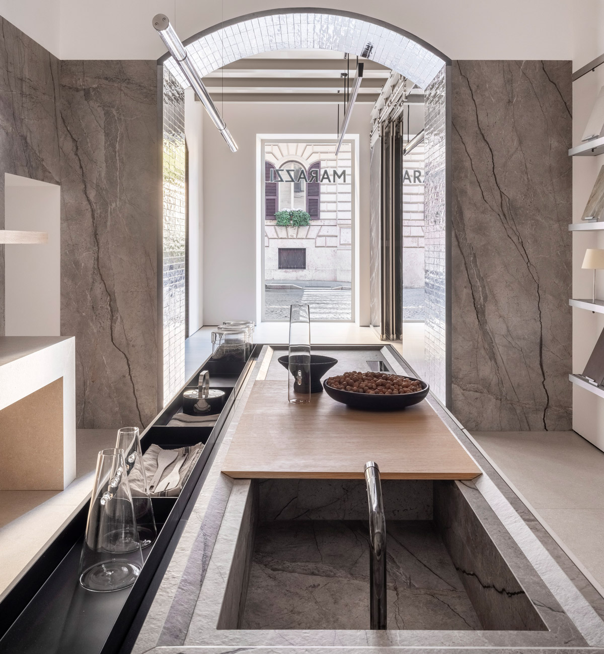 Les grandes fenêtres de la Via Vittorio Emanuele Orlando offrent un aperçu captivant de la disposition de l’espace, où des jeux de perspectives et de matériaux guident les visiteurs à travers une expérience de découverte continue à l’intérieur du showroom.