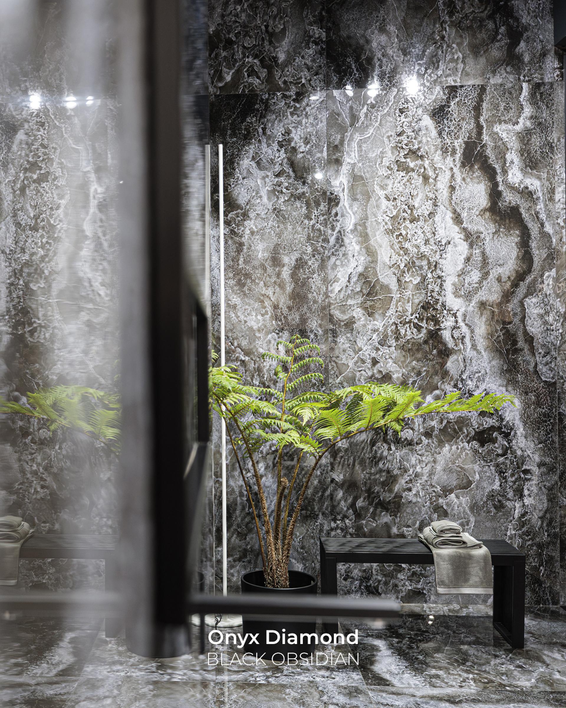 La collection Onyx Diamond s’enrichit d’une nouvelle couleur – Black Obsidian. Une collection qui capture l’essence précieuse de l’onyx et l’exalte avec le scintillement des microcristaux intégrés grâce à la technologie innovante « Diamond Shard Effect ». Avec une palette composée de 8 couleurs élégantes en 3 formats différents (120×280, 120×120, 60×120 cm), Onyx Diamond s’intègre harmonieusement dans les espaces contemporains, offrant des solutions esthétiques raffinées pour des projets exclusifs et à fort impact visuel.