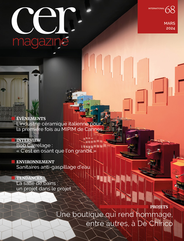Cet étonnant projet est rehaussé par la collection céramique Seletti 4 de Ceramica Bardelli : « J’ai imaginé utiliser cette collection pour créer un décor spectaculaire pour les machines à café. J’ai opté pour des carreaux biseautés 3D semblables à des bijoux, en noir pour les voûtes à la De Chirico, et en cerise pour l’escalier d’exposition à la Escher, monté en casse-briques pour créer un certain dynamisme ; Pour la salle des miroirs, j’ai utilisé les carreaux biseautés au mur mais également au plafond, pour créer un effet d’infini reflétant les couleurs du mur LED, tandis que pour le sol, j’ai choisi la série Distortion, pour former un chemin noir avec des bandes de passage piéton ». Carmine Abate utilise souvent la céramique : « J’ai récemment conçu un magasin de vêtements avec 20 000 carreaux posés partout. Je décontextualise souvent le carreau, un produit qui était autrefois associé à la sphère domestique, que j’aime utiliser dans les magasins et les différents établissements. Je préfère la céramique car c’est un matériau très pratique, surtout dans le secteur commercial, il ne nécessite pas d’entretien et, contrairement à la peinture et à la résine, il ne se raye pas et ne se détériore pas, il est donc idéal dans les endroits très fréquentés. La céramique est non seulement résistante et pratique, mais elle assure également un rendu esthétique incroyable qui contribue à créer des décors spectaculaires du plus bel effet ».