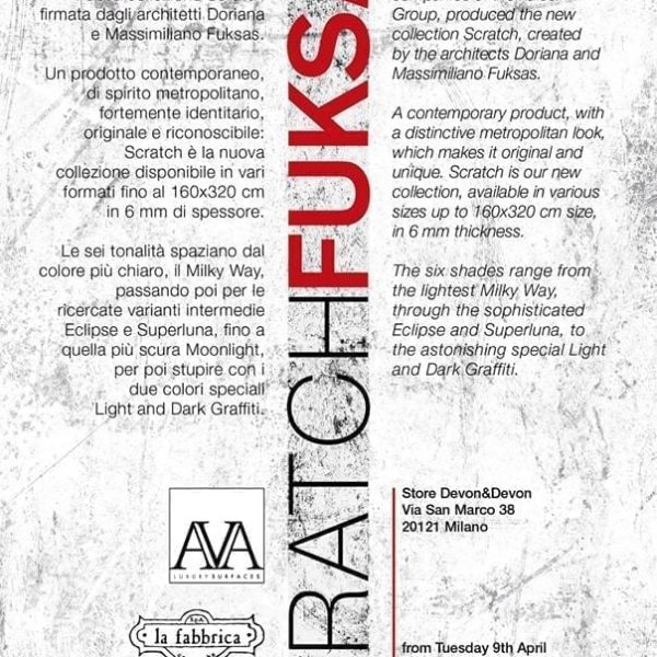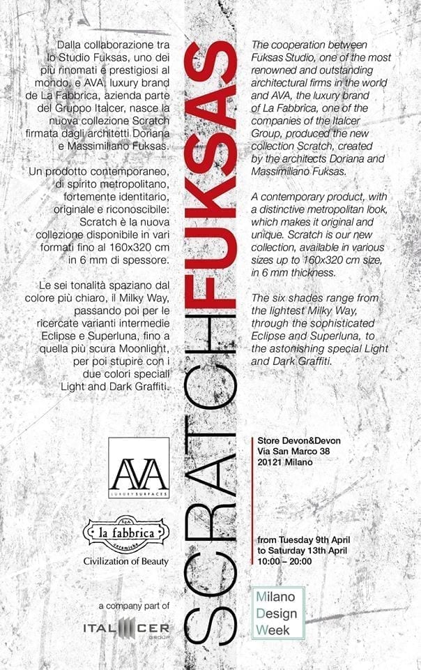 “Scratch è un segno che si fa identità contemporanea del vivere quotidiano. Un gesto che nella sua semplicità plasma e trasforma lo spazio. È spirito metropolitano. Diventa lavagna che scrive e riscrive il presente. E il futuro. È materia che segna lo scorrere del tempo. Che lo ferma e incanta lo sguardo”. Doriana e Massimiliano Fuksas.