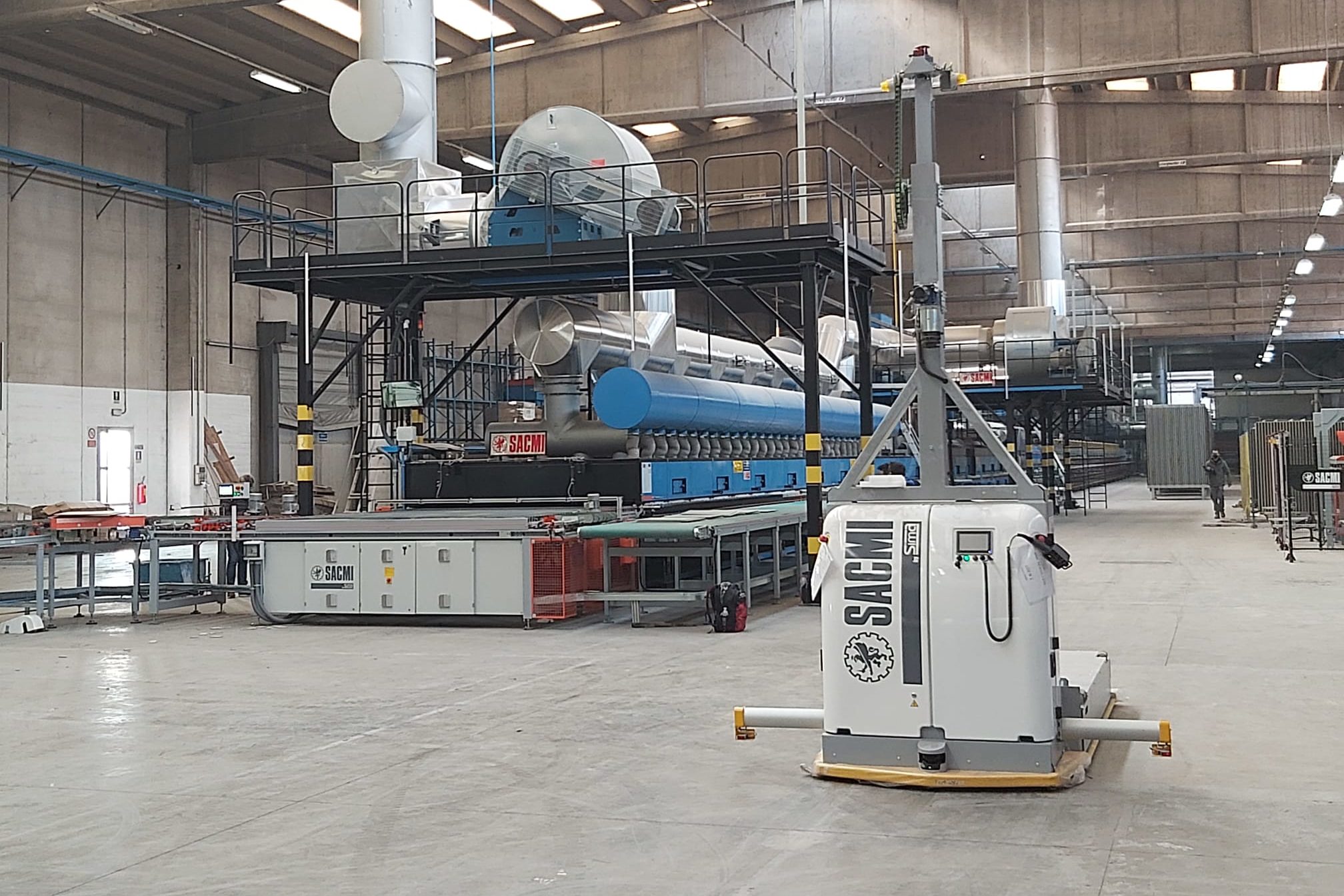 Una rivoluzione completa, per ITA Ceramiche, che comprende tutte le movimentazioni a monte ed a valle della macchina termica. Con la nuova fornitura, tutti i pezzi in uscita dalla smalteria e diretti al nuovo forno vengono infatti movimentati su veicoli laserguidati LGV, di fornitura SACMI. Grazie all’automazione degli stoccaggi, sarà possibile saturare la maggiore capacità produttiva del forno, lungo 117 metri e dalla larghezza utile di 2.950 mm.