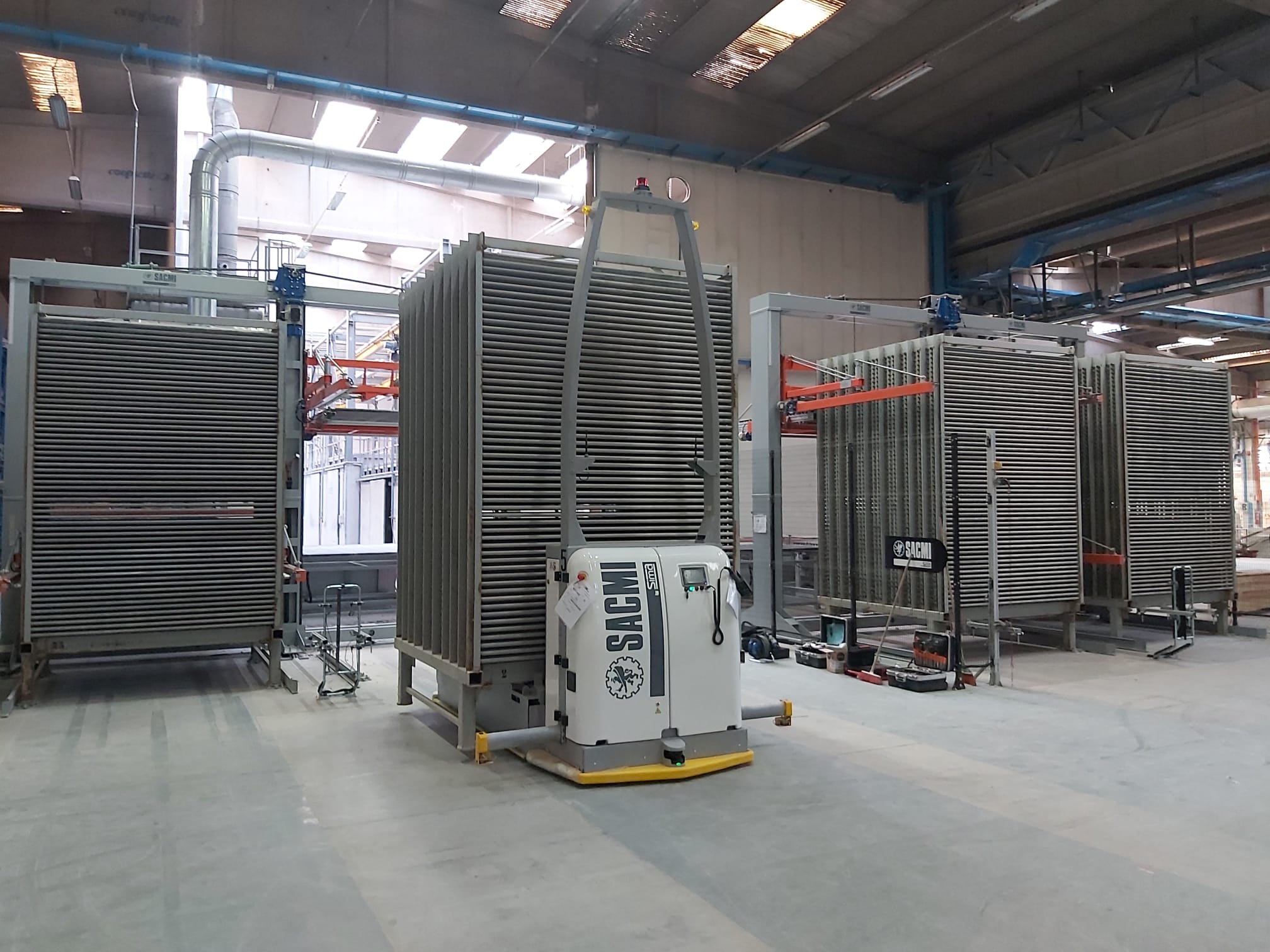 Automatizzata anche la fase di carico-scarico forno, con panconatrici automatiche che depositano i pezzi su ulteriori LGV diretti alle linee di scelta e rettifica, configurate per la gestione di 16mila mq/giorno. Le due nuove linee fornite – equipaggiate ciascuna con 7 impilatori – sono state progettate da SACMI per rispondere ai fabbisogni produttivi della clientela che, accanto alla storica produzione 320×320 mm, comprendono oggi un ampio mix produttivo, composto dai formati 170×620, 220×900, 200×1200, 300×600, 600×600, 600×1200, 450×450, 200×400, 200×200 ed infine il 900×900, che entrerà in produzione entro maggio 2021.