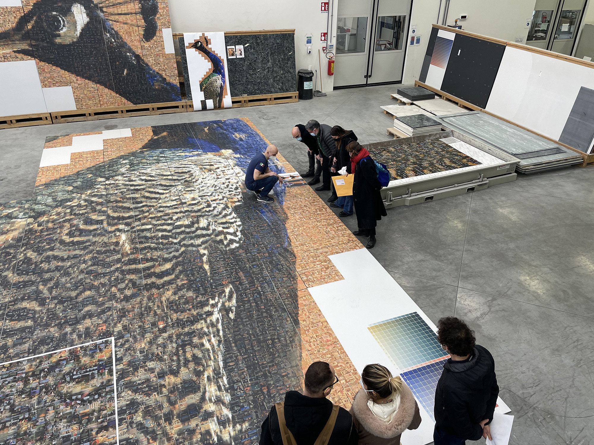 La progettazione e l’installazione dell’opera – alta ben sedici metri – sulla facciata di Palazzo dei Musei è il risultato della sinergia tra il Comune di Reggio Emilia (Musei Civici) e Marazzi Group, la cui divisione specializzata Marazzi Engineering ha seguito la produzione delle ceramiche che compongono l’opera e ha ospitato Fontcuberta durante le fasi di produzione e stampa digitale.