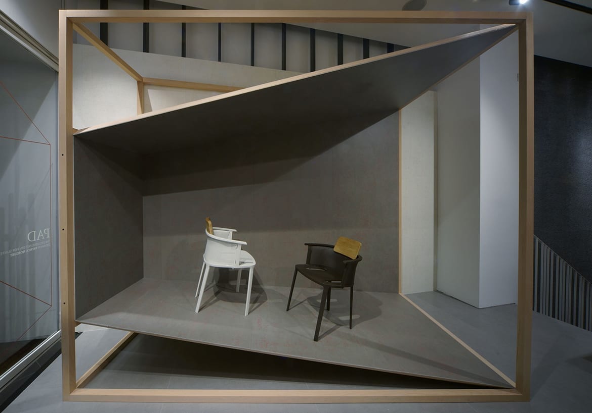 “Grand Angle è una scenografia che ho progettato per la presentazione della mia nuova collezione di decori, PAD. Le lastre sono sospese in un gioco di falsa prospettiva che crea profondità e ci porta nel mondo del prodotto. La struttura, estremamente semplice, esalta le varianti Tamis e Oakland. Queste scatole, loro stesse elementi dello spazio globale, suggeriscono una differente prospettiva che permette di mettere in scena da un lato combinazioni di motivi e dall’altro diversi usi della ceramica (pavimenti, pareti, soffitti).” Patrick Norguet