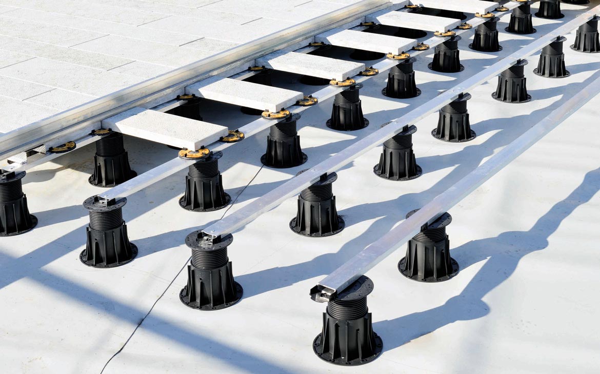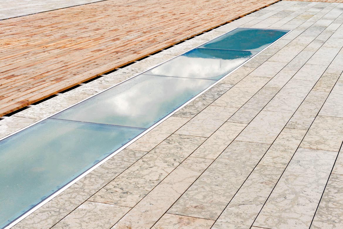 Il pavimento soprelevato è composto da grandi piastrelle di pietra e lunghe assi di legno sorrette dalla struttura Rail System. Questo sistema è composto da supporti regolabili in altezza, su cui poggiano i magatelli in alluminio Rail. Su questi magatelli trovano posto le teste Top Rail AS, che supportano gli elementi della pavimentazione. Tutti questi elementi sono prodotti con materiali riciclati e sono a loro volta riciclabili. Rail System fa parte della grande famiglia di prodotti Pedestal Line di Impertek per la realizzazione di pavimenti flottanti.