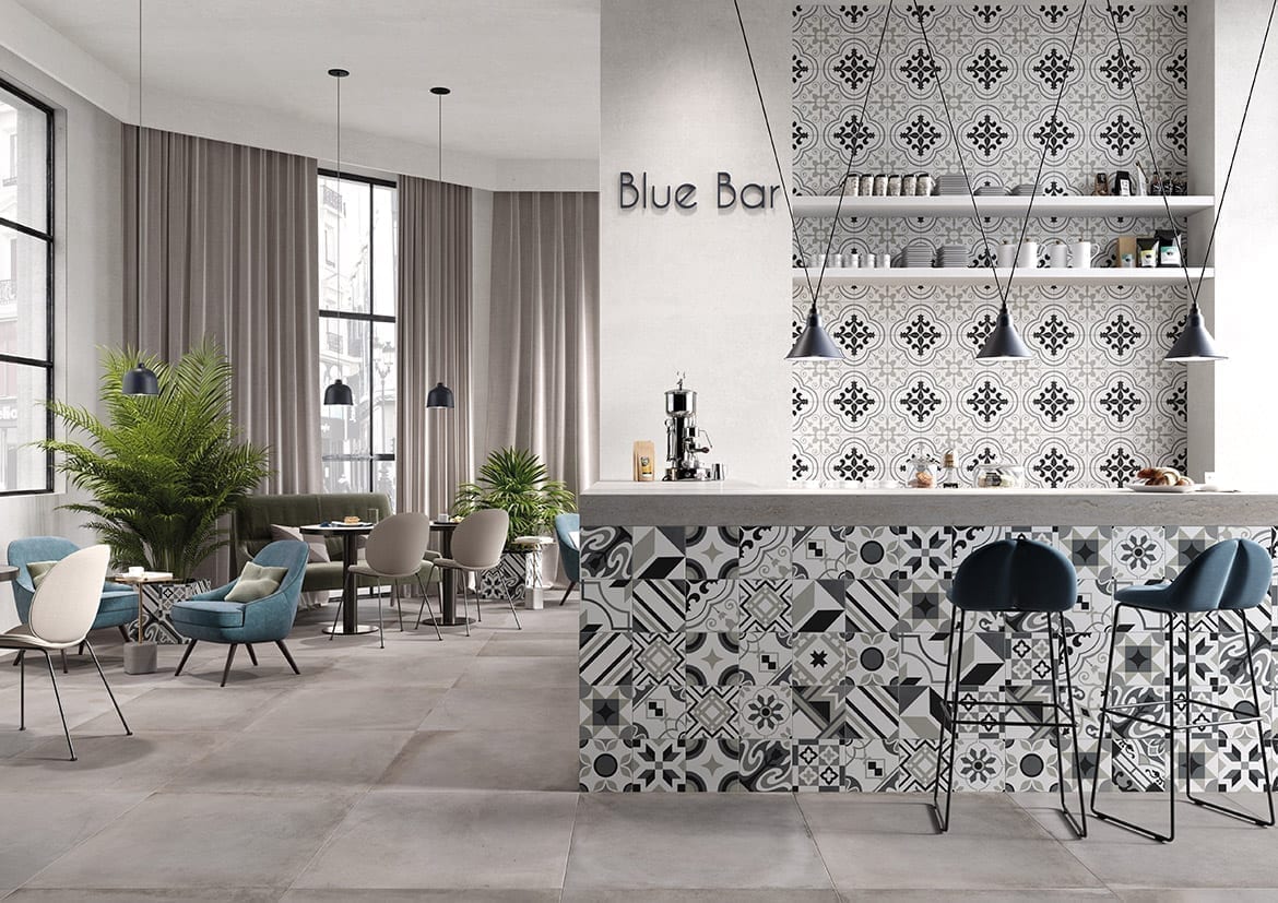 Ideali per pavimenti e rivestimenti, i decori singoli e mix a 19 soggetti, nelle tre gamme beige, blu e bianco e nero, sono accompagnati da 5 fondi a tinta unita perfettamente abbinabili.