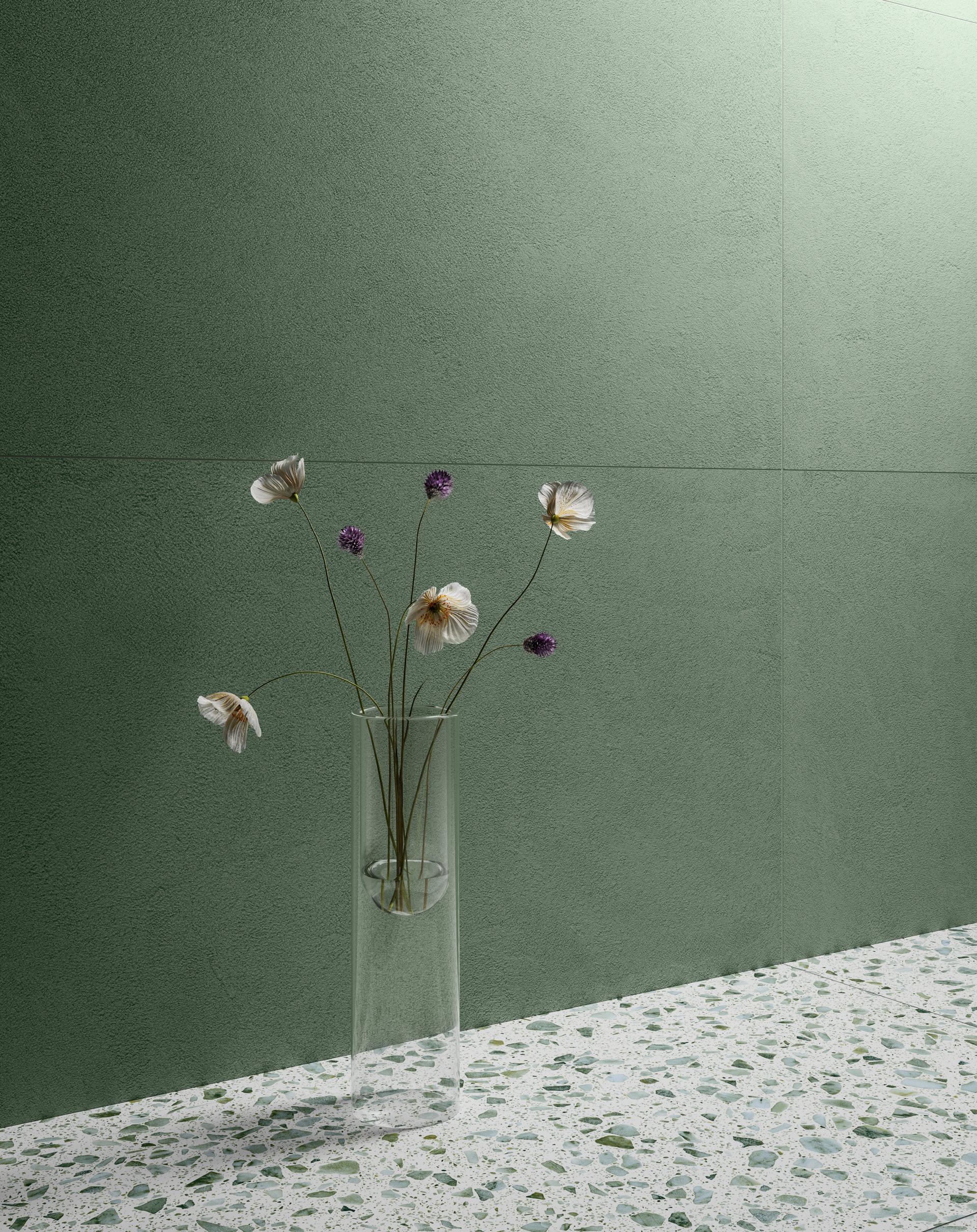 IRO prende ispirazione dalla texture materica dell’intonaco per un effetto muro in colore che giochi in abbinamento a grafiche ispirate a motivi terrazzo con tocchi di colore brillanti.