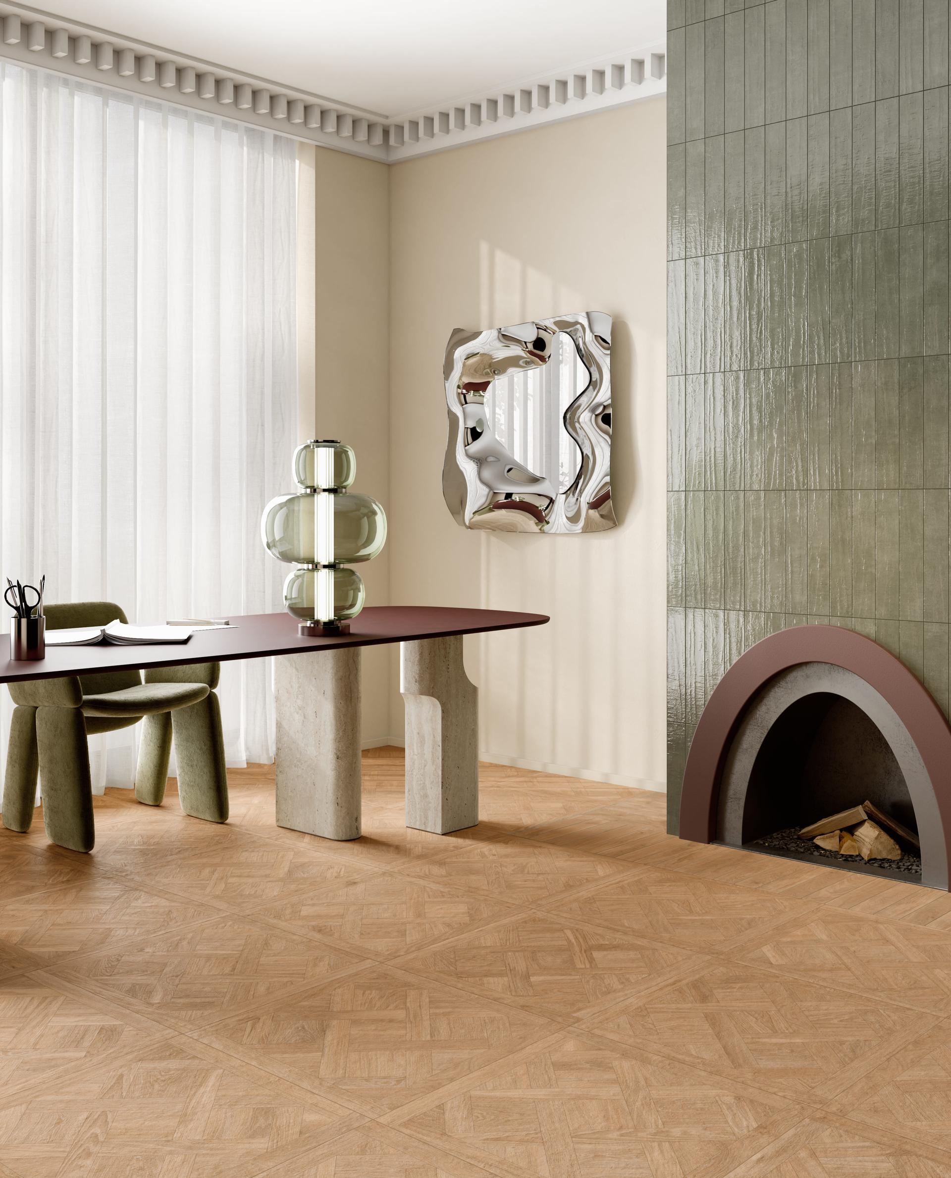 Tre essenze lignee differenti conservano i loro tratti unici, facendoci immergere nel rispetto della natura: Rovere dei Medici, Rovere Sbiancato e Olmo. Tre formati contemporanei, a plancia grande 26,5×180 cm, a plancia tradizionale 20×120 cm, e una dedicata all’esterno 40×120 cm, un motivo cassettonato moderno ma tradizionale nel formato quadrato e un piccolissimo formato brick tornato in auge in questo ultimo biennio. La struttura nuova, “piallata”, dedicata a questa collezione, lo attualizza e gli conferisce maggiore tridimensionalità.