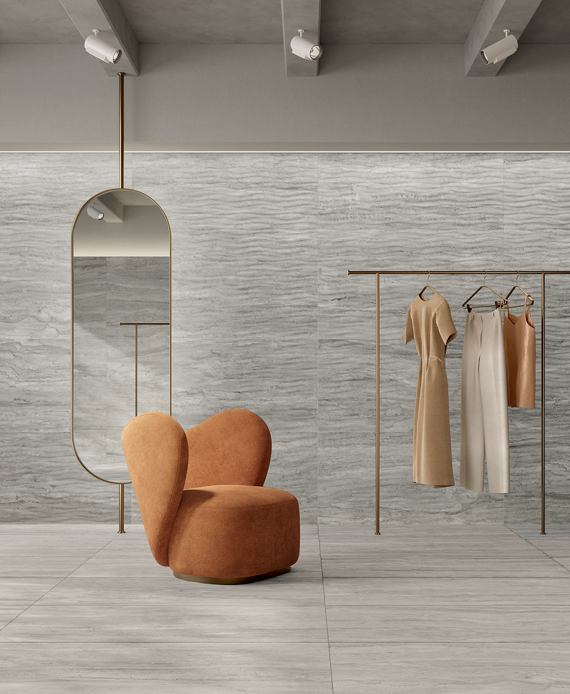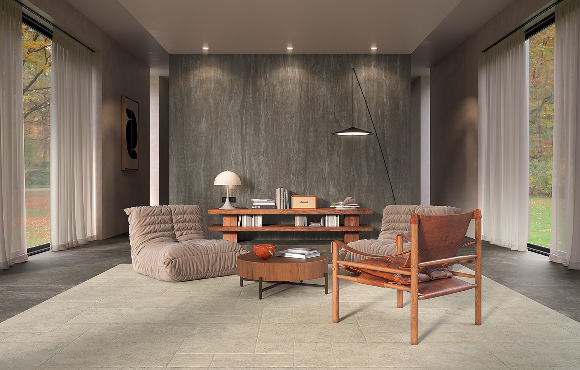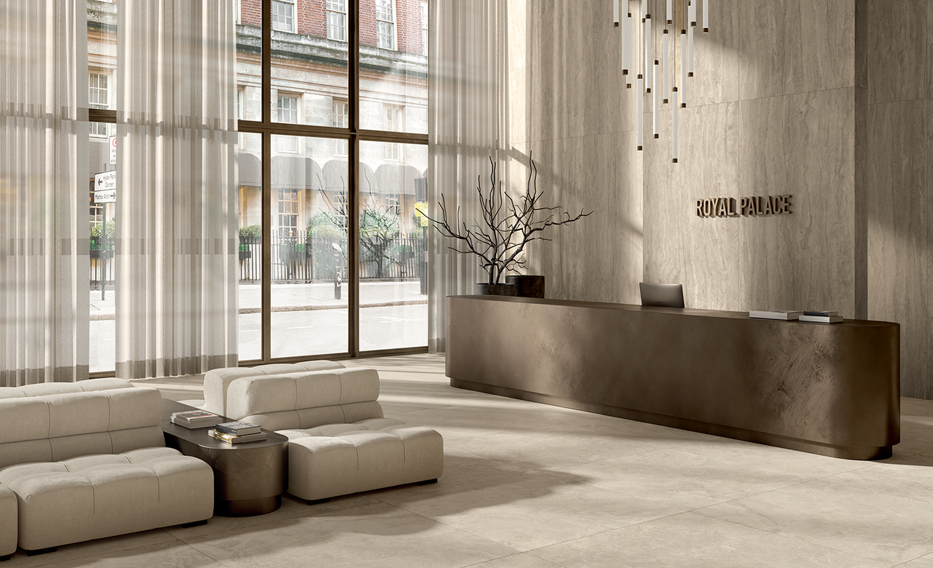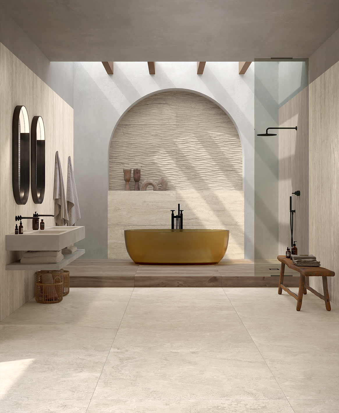 Royal Travertino è l’interpretazione contemporanea di una pietra millenaria in un gres porcellanato di ultima generazione. La collezione è composta da una struttura omogenea, con piccoli pori che ne aumentano la tridimensionalità, declinata in quattro tonalità su due tipologie di superfici. I fondi Vein, caratterizzati da ampie venature, sono pensati per dare slancio ai rivestimenti, mentre i fondi Cross, dalla texture più compatta, completano l’offerta a pavimento.
