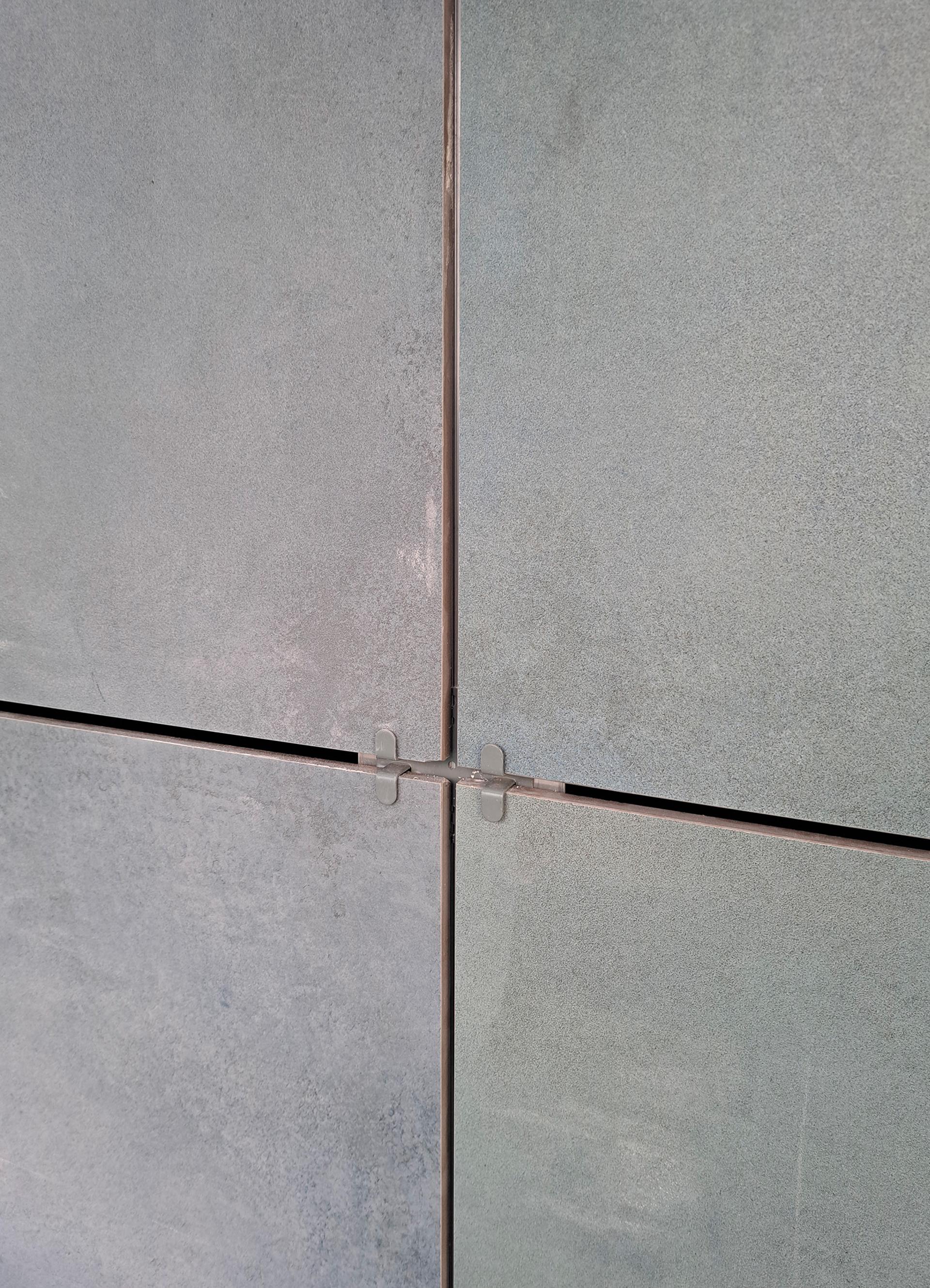 Questa visione si è tradotta in un dialogo cromatico tra i diversi volumi architettonici, con una strategia che ha seguito la morfologia degli edifici. Per i condomini Consap e San Daniele, caratterizzati da sviluppo orizzontale, è stata scelta la collezione Metal Design di Cerdisa nella finitura Brass. Le grandi lastre in gres porcellanato donano alle superfici un aspetto metallico cangiante che cattura la luce, aggiungendo un tocco di sofisticata modernità. Le torri del complesso Alpi si distinguono invece per le audaci finiture della collezione Fresco del Gruppo Cerdisa Ricchetti. I colori Sage Green e Blue Whale, sempre in formato 60×120 cm, creano un vivace gioco di volumi che si staglia nel panorama urbano, trasformando gli edifici da anonimi blocchi residenziali a elementi architettonici di carattere.