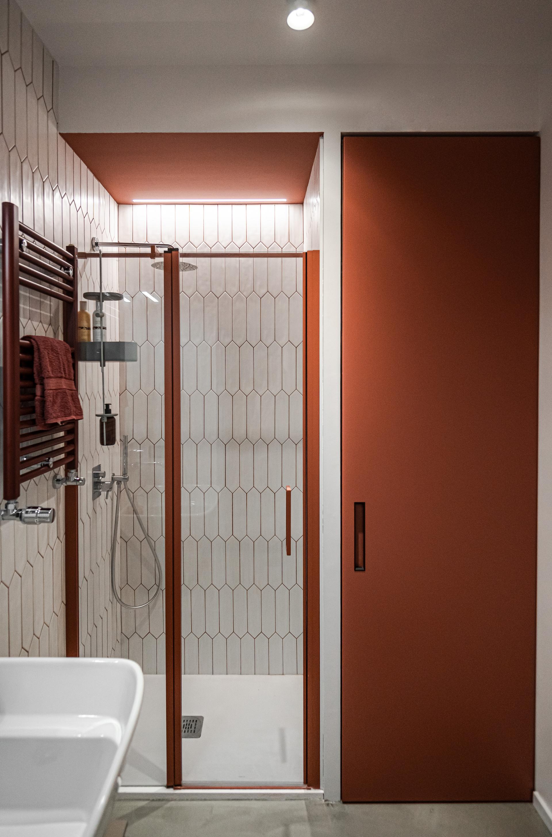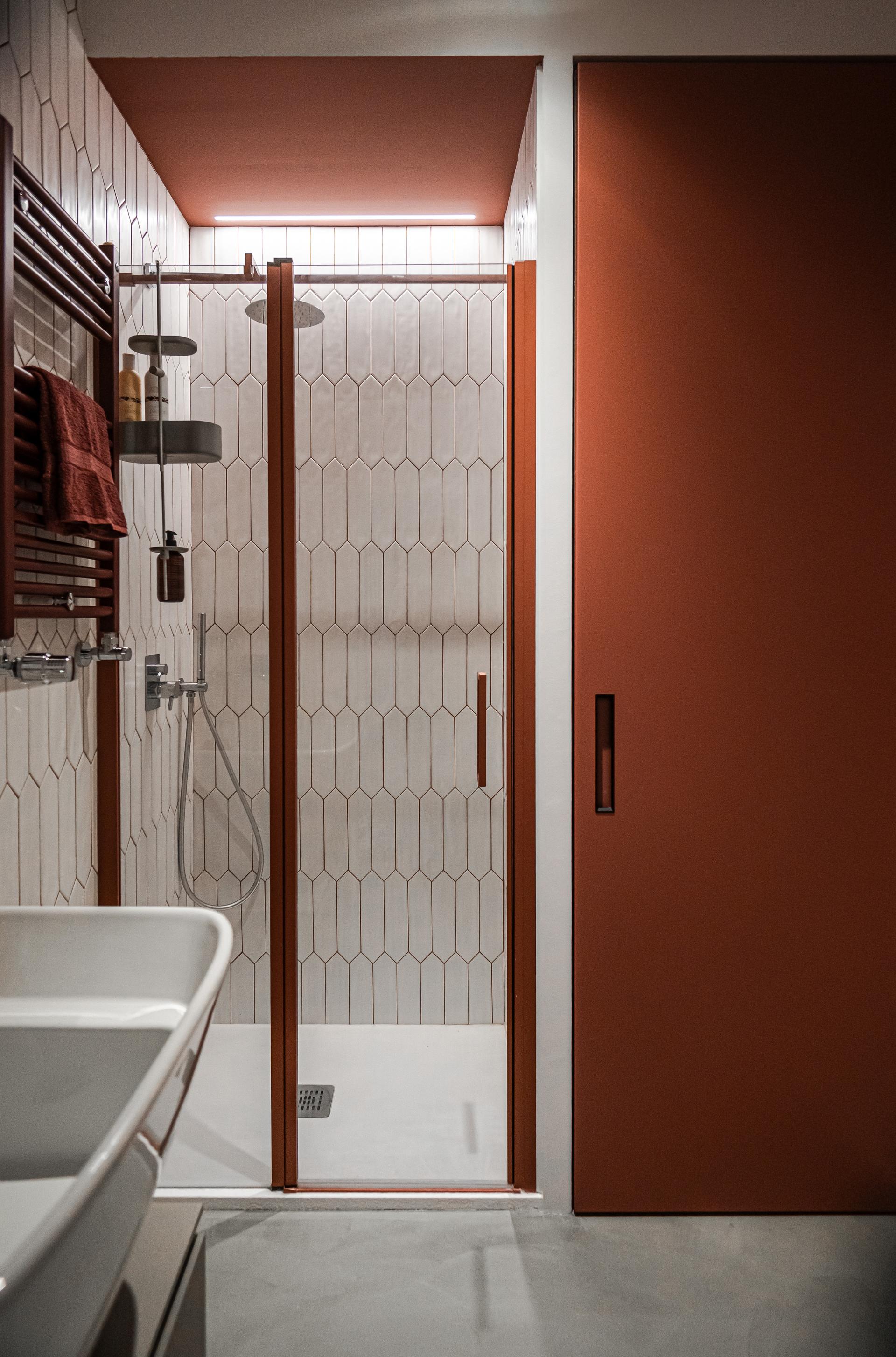 Fondamentale, per raggiungere l’obiettivo, è stata l’attenta ricerca sui materiali, da affiancare fra loro con particolare cura per far sì che il dialogo risultasse armonico; ceramica, metallo e resina sono i tre protagonisti, come racconta la progettista: “i materiali principali che ho scelto per questo progetto sono diversi, ciascuno selezionato con l’obiettivo di creare coerenza estetica e funzionalità. Per il rivestimento a parete della doccia e del lavabo ho utilizzato la ceramica smaltata Dart, di Tonalite, caratterizzata da una forma a losanga posata in verticale e valorizzata dal contrasto con le fughe colorate. La chiusura della cabina doccia è in vetro trasparente, con una struttura in metallo verniciato coordinato al tema cromatico generale. Sempre in metallo verniciato sono anche il termoarredo, la struttura della doccia e le finiture, declinate in tonalità come terracotta o ruggine”.