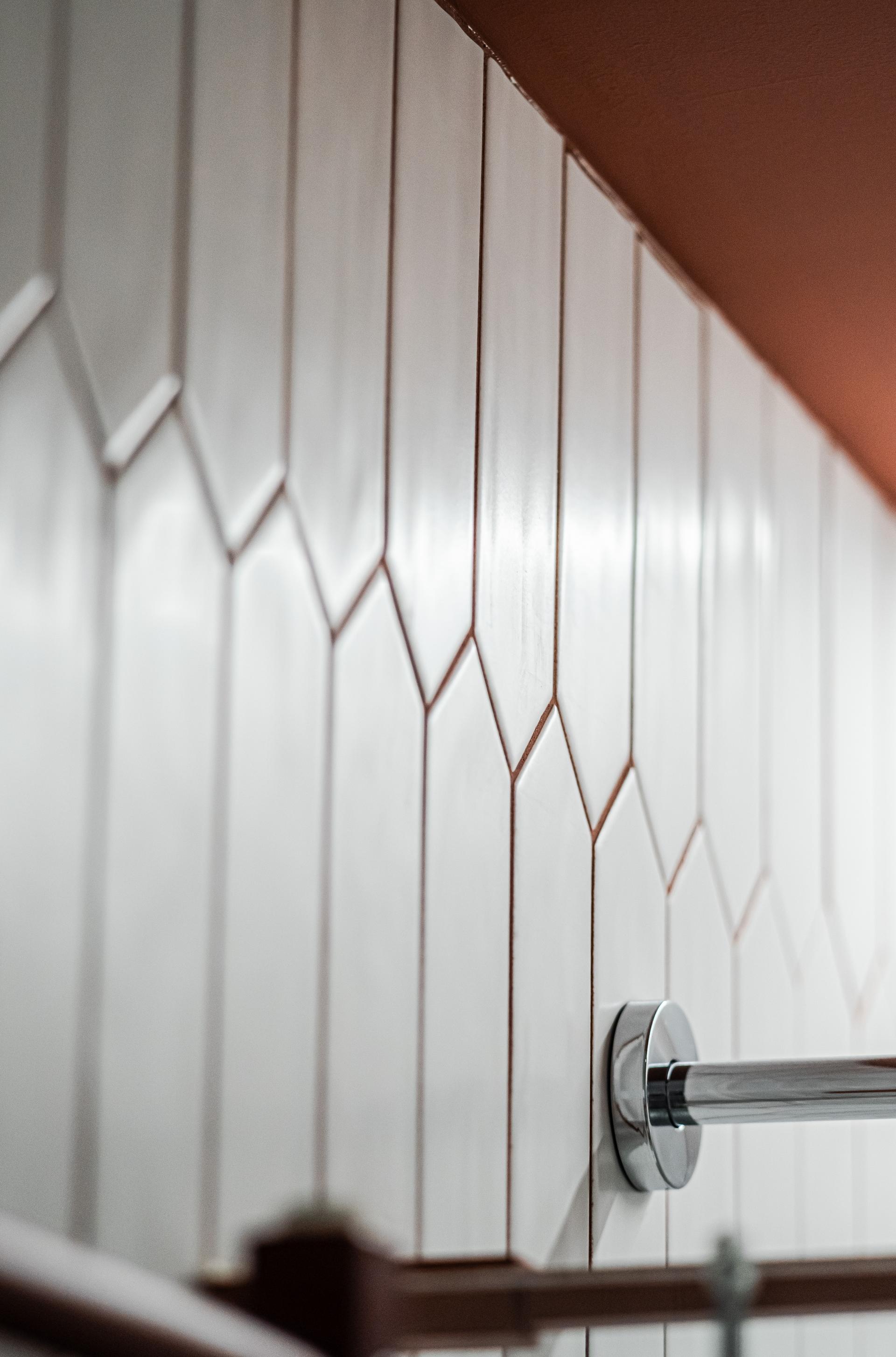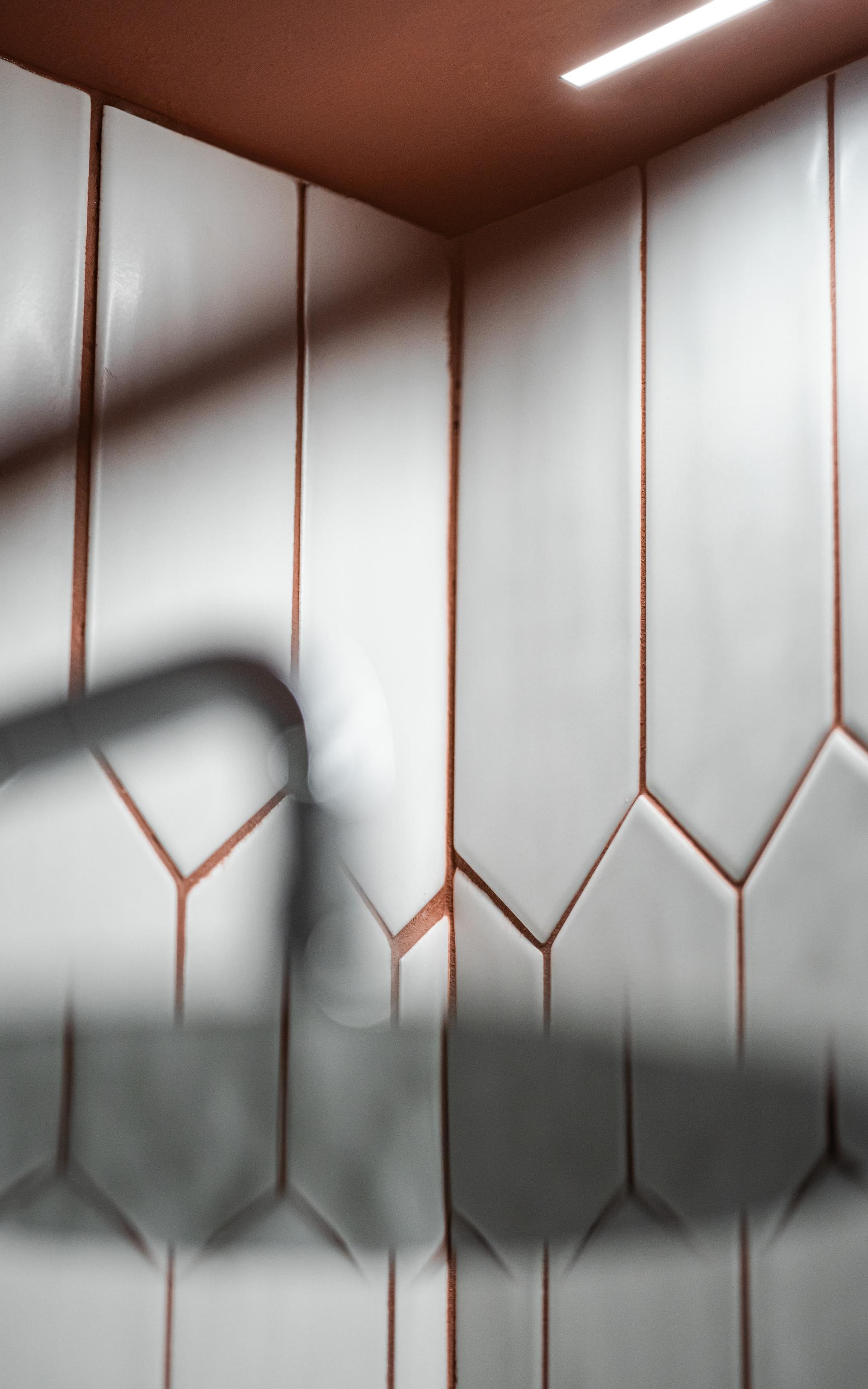 La ceramica, determinante nel costruire l’identità dello spazio, è stata scelta per le sue caratteristiche tecniche di resistenza all’umidità e facile manutenzione, fondamentali in un ambiente bagno, ma anche per il suo valore estetico, “il formato verticale e la finitura lucida enfatizzano la verticalità, facendo sembrare lo spazio più alto e la posa delle piastrelle esagonali strette, inoltre, crea un ritmo visivo contemporaneo”, specifica Laura Cugnidoro, che racconta come la scelta di Tonalite sia stata motivata dalla qualità artigianale della sua proposta e dall’ampia gamma cromatica disponibile. La sua affidabilità tecnica, che si concretizza nella precisione nei tagli, nella durabilità e nella facilità di installazione, inoltre, è garanzia anche di ottimizzazione del processo e contenimento degli sprechi. Il progetto ha infatti tenuto in considerazione anche la sostenibilità dell’insieme, privilegiando materiali durevoli e facilmente sanificabili – a favore di una manutenzione minima – oltre alla scelta di prodotti locali, per abbattere l’impatto ambientale legato ai trasporti.