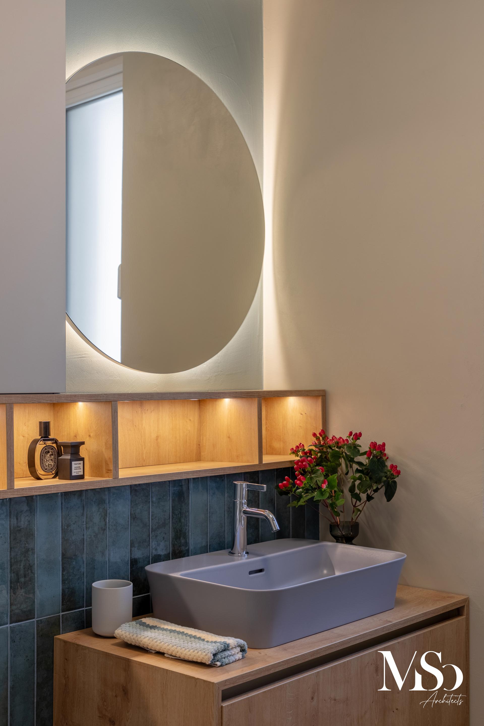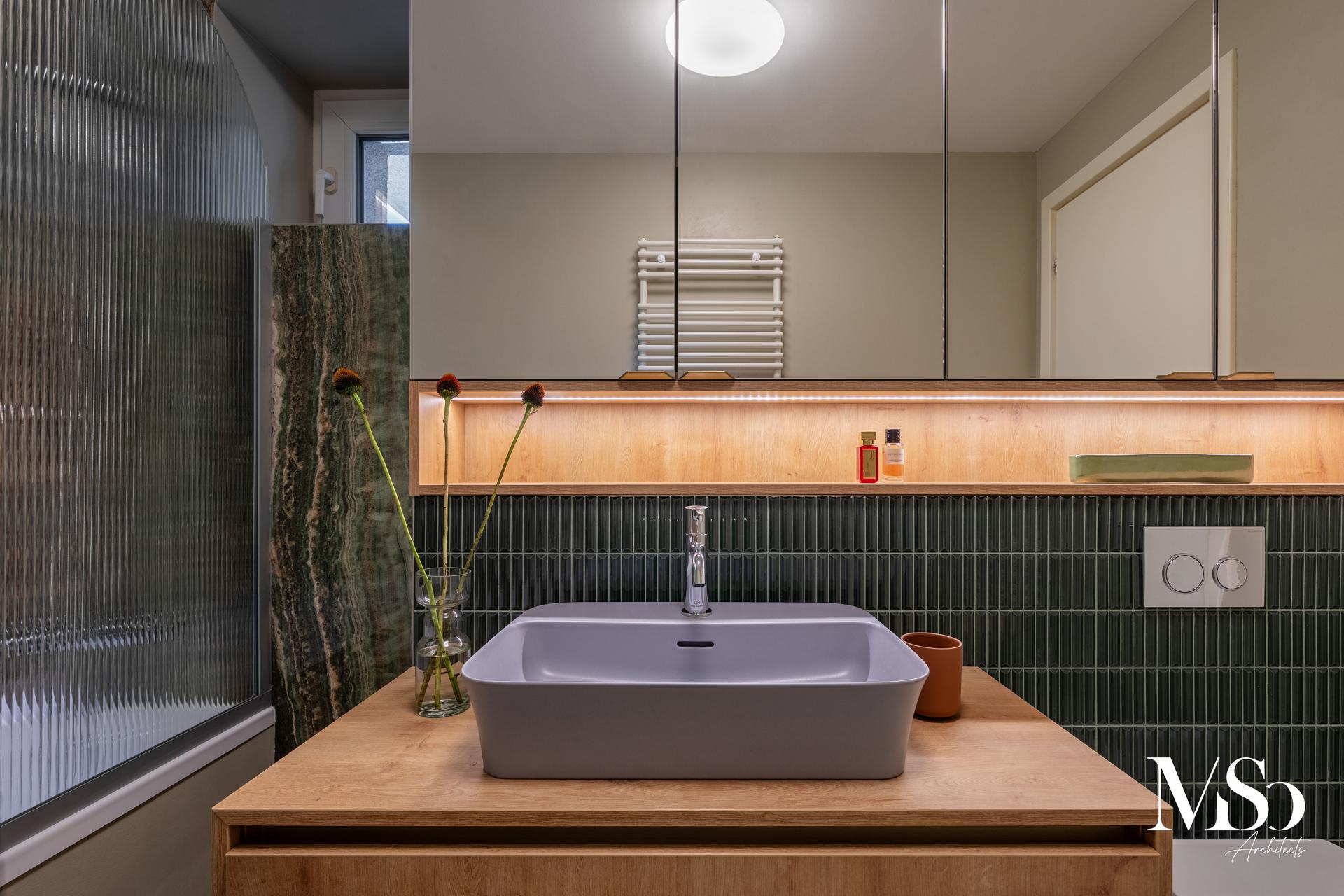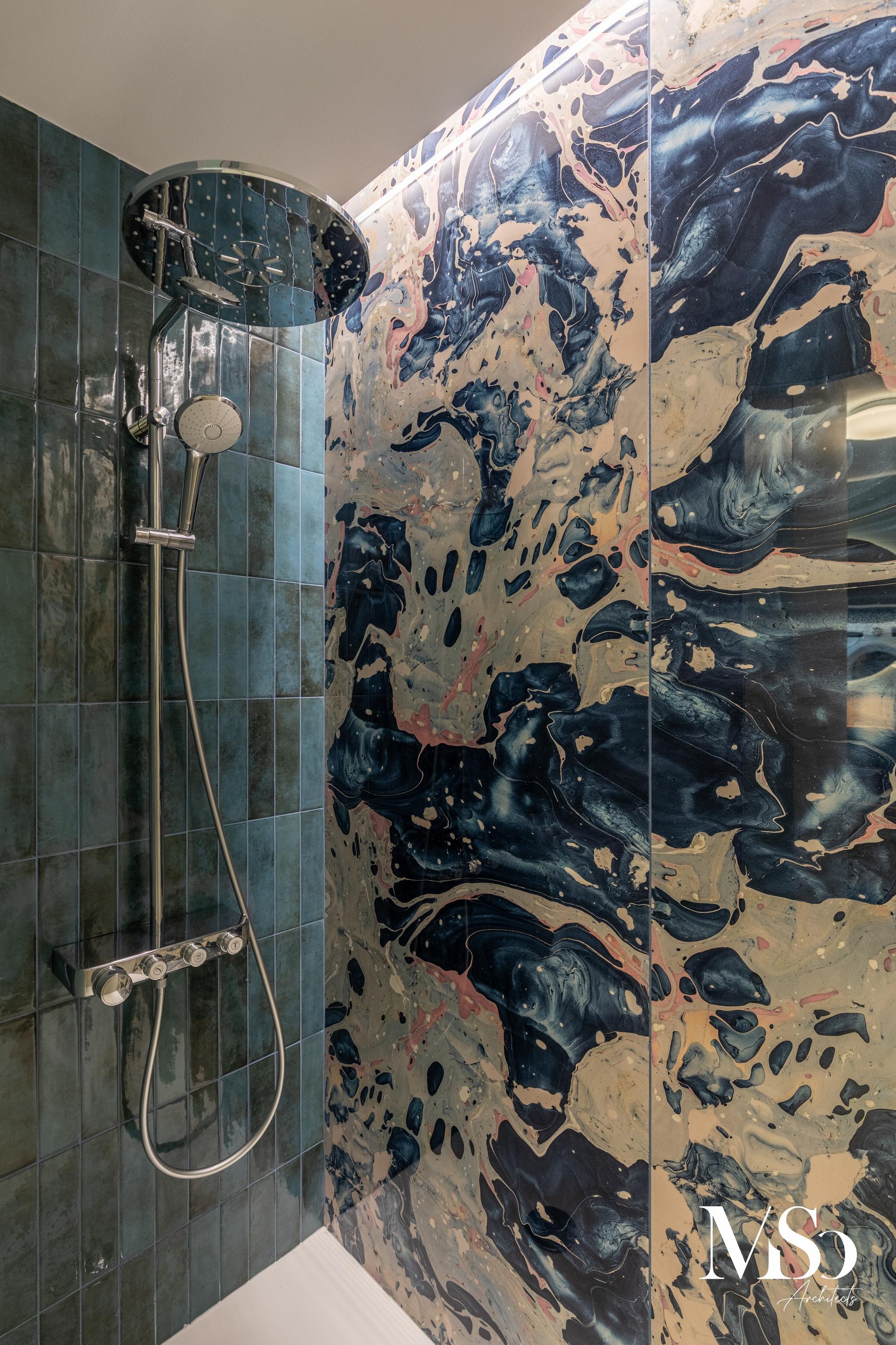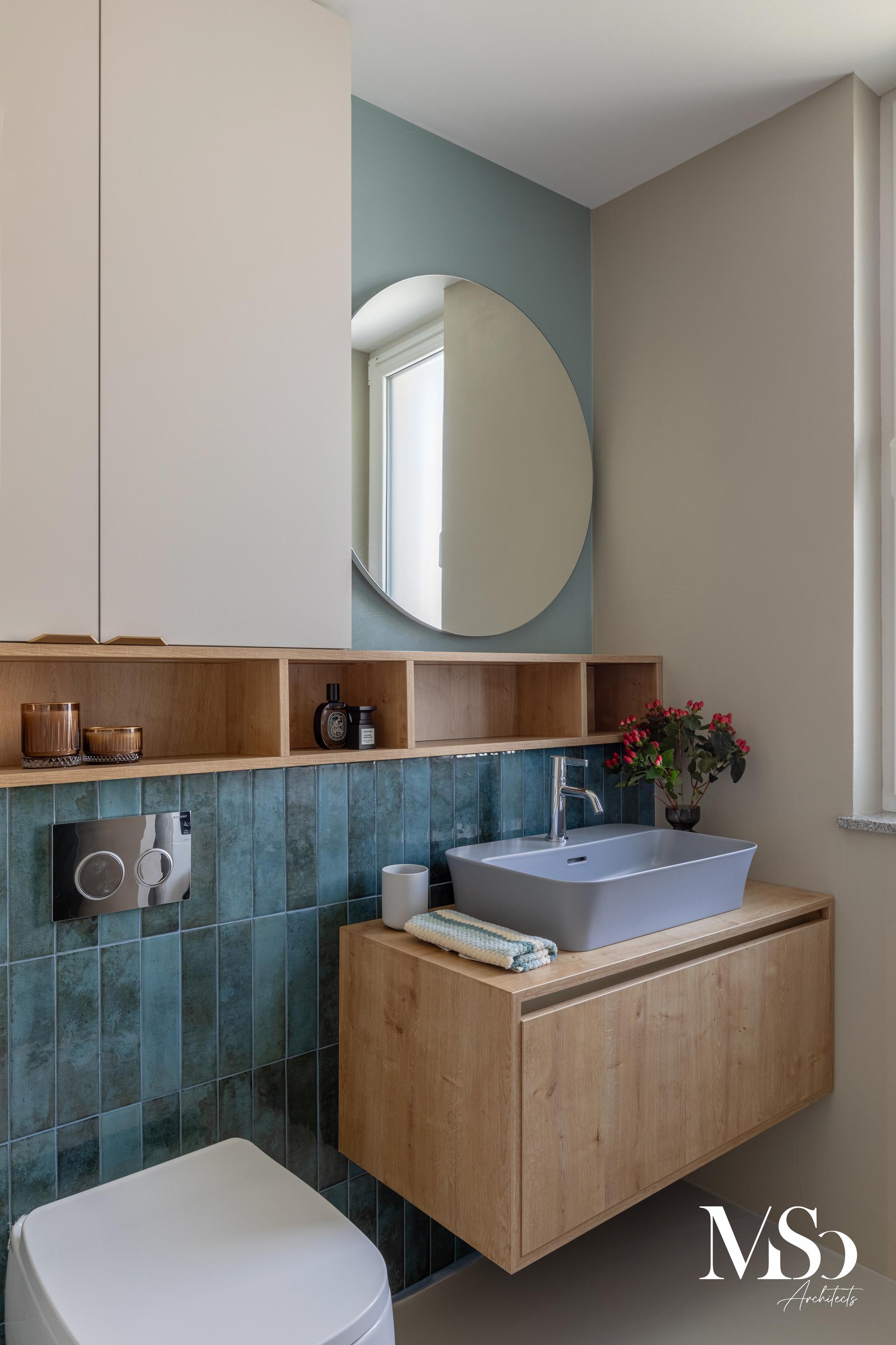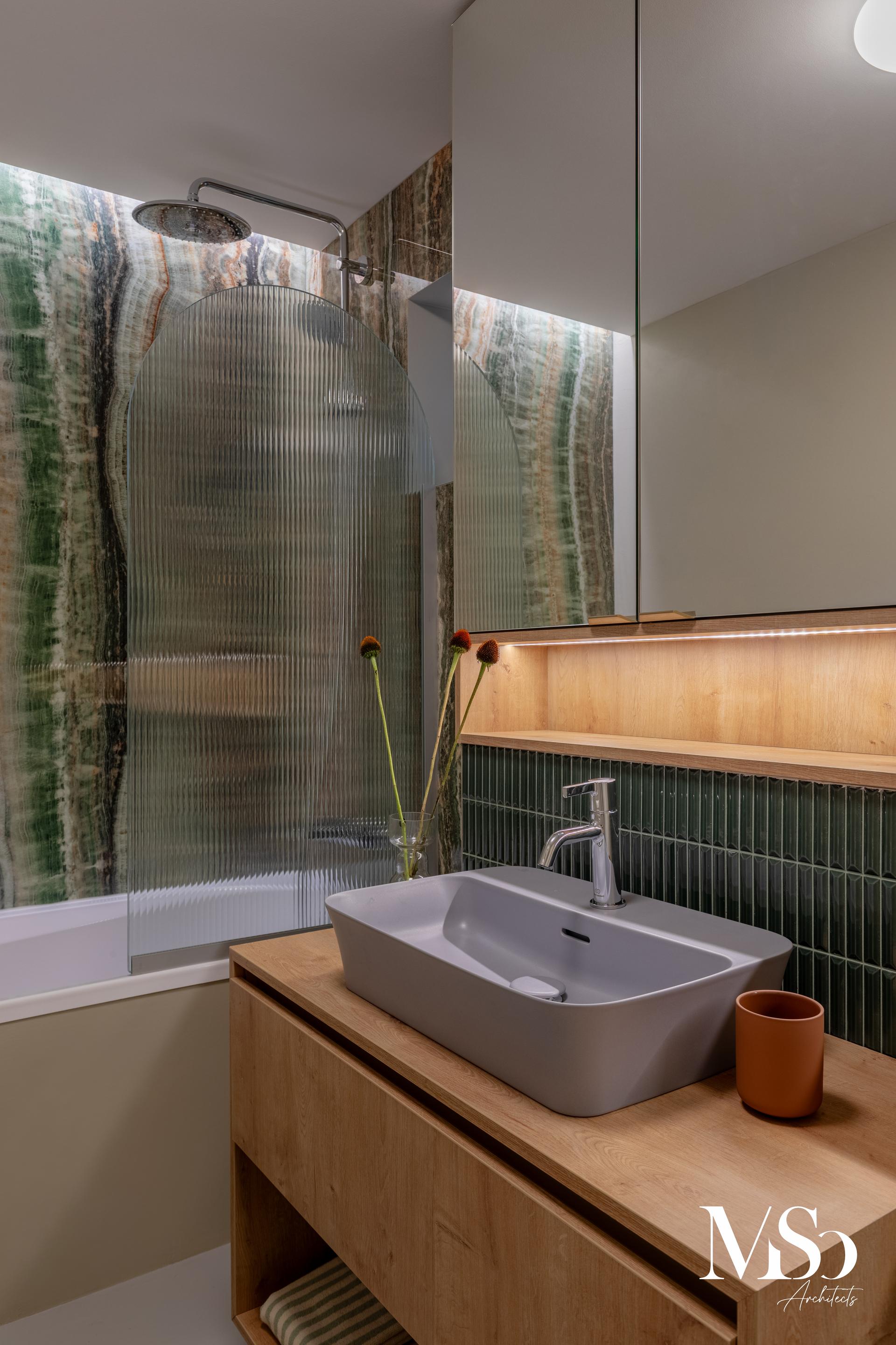 Nel secondo bagno, cambiano proporzioni e atmosfera: un rivestimento più profondo accompagna la zona doccia, evocando un paesaggio raccolto e quasi notturno con la collezione Foliage, sempre di Tonalite, nella variante Blu 6×24,6 cm. L’intervento è scandito da scelte cromatiche coraggiose e dettagli misurati: ogni materiale è inserito con coerenza, a supporto delle funzioni, mai in sovrapposizione. L’illuminazione, spesso integrata o indiretta, contribuisce a creare scenari variabili, adatti a ogni momento della giornata. Zestful Apartment è il risultato di un progetto che non cerca l’effetto, ma la relazione: tra spazi, persone e materia.