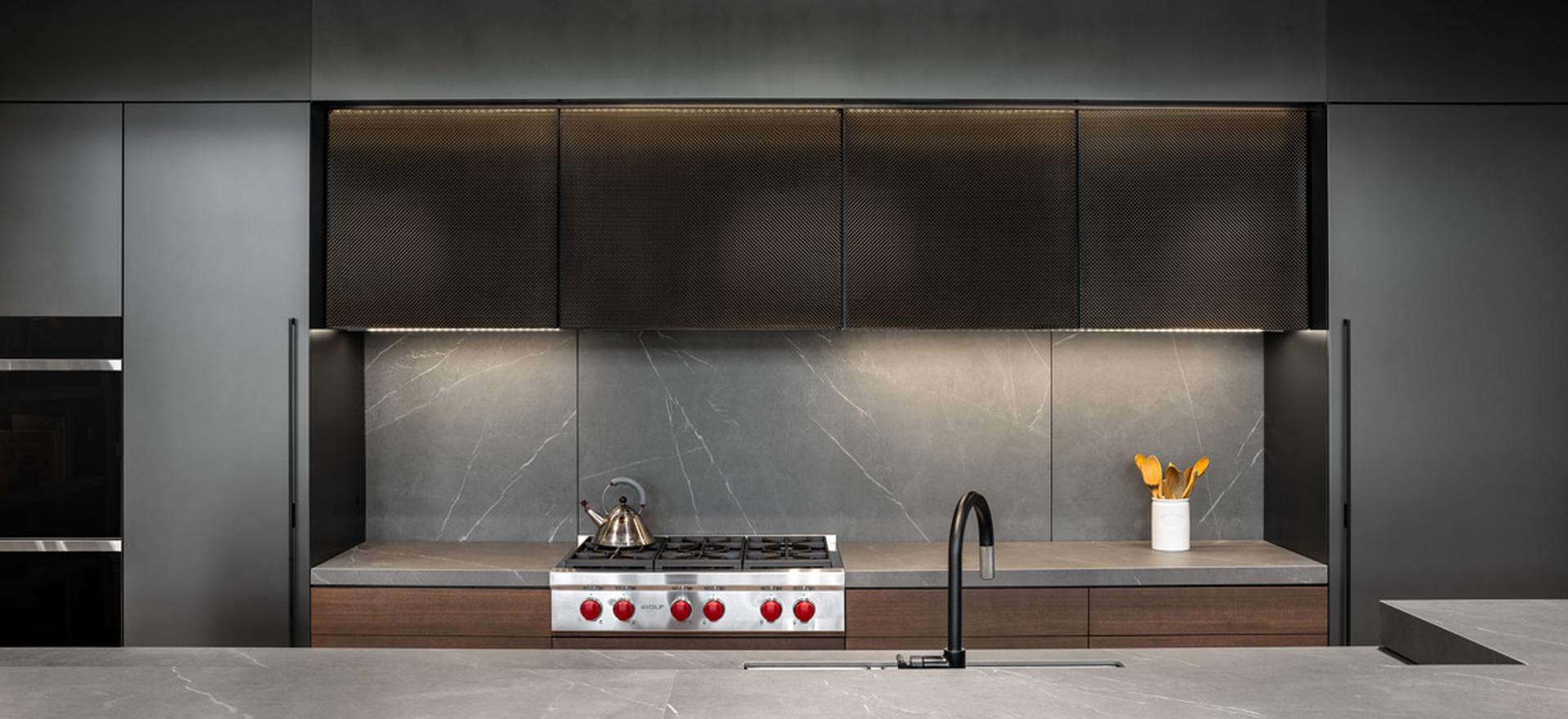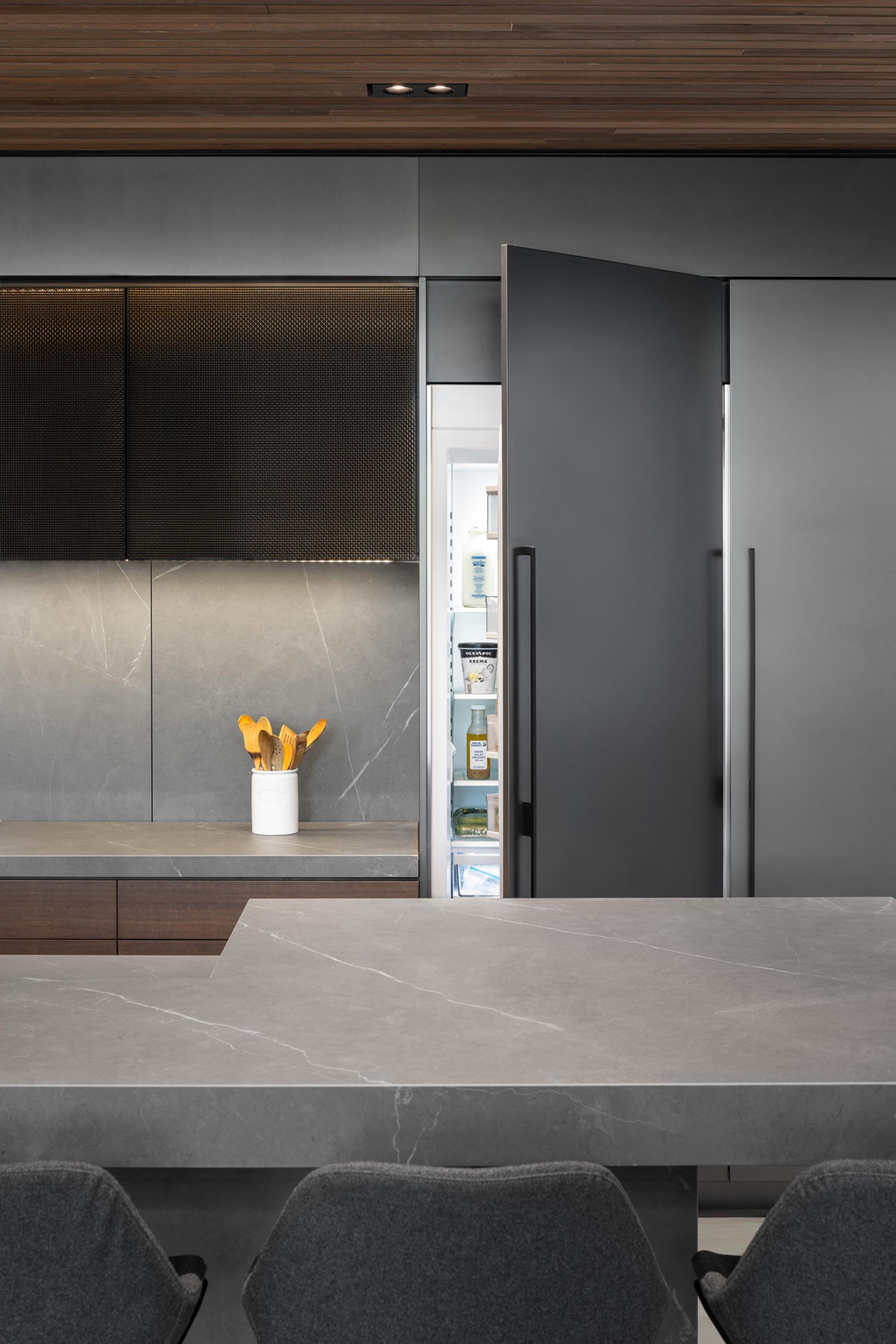 Il grande formato (162×324 cm) della collezione Laminam I Naturali nella tinta Pietra Grey è il protagonista della cucina con le sue delicate venature color ardesia: riveste il bancone e il piano cottura, ma disegna anche le mensole e le ante scorrevoli della dispensa, creando un filo conduttore visivo raffinato e coerente.