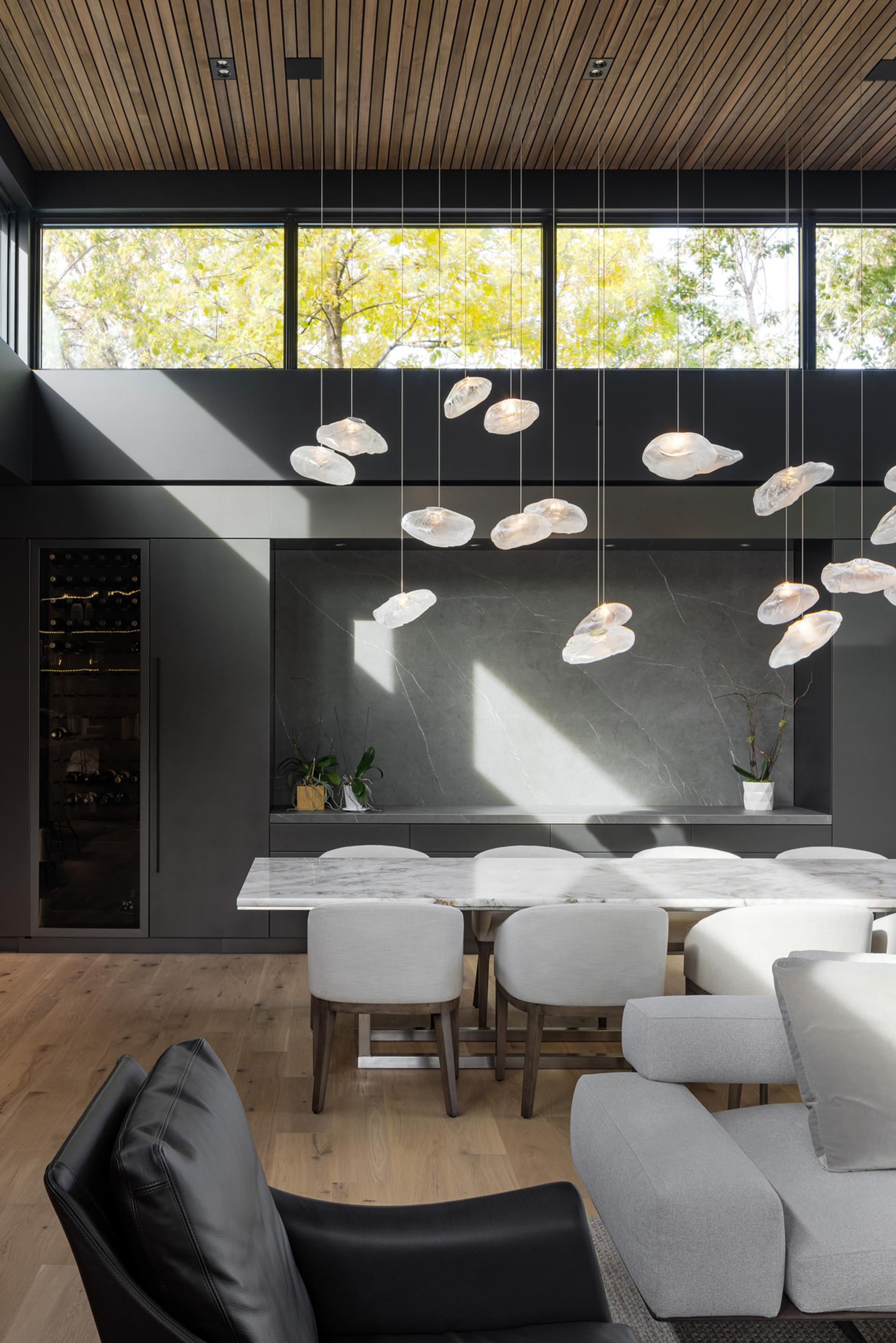 Dal punto di vista distributivo, la villa prevede al piano terra un’ampia e luminosissima area giorno, dove living e cucina, con sviluppo a penisola, si susseguono senza soluzione di continuità. La sottile soglia che separa ciò che sta dentro da ciò che sta fuori si dilata, creando un patio esterno che accoglie un’altra cucina e una sauna, entrambe affacciate sul fiume. Al piano superiore, la zona notte ritaglia spazi più intimi, ma il collegamento con il paesaggio rimane sempre una priorità. Qui il design del team canadese promuove il riposo, per creare un’oasi di serenità.