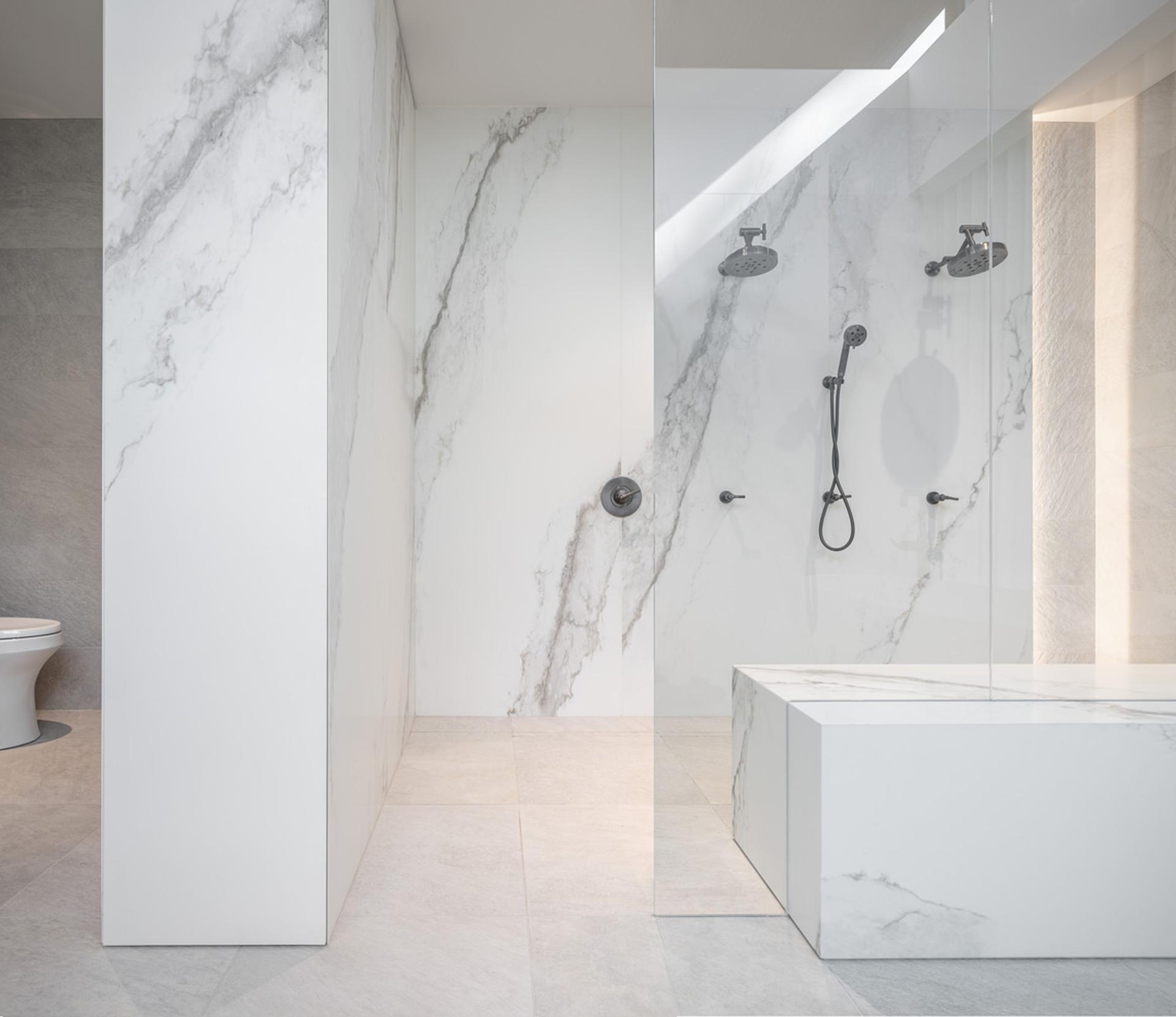 La collezione ‘Glocal’ di Mirage, invece, riveste l’area dell’ingresso, sposandosi perfettamente con la pulizia formale degli interni. Stessa scelta materica anche per la lavanderia e i bagni di servizio, che invece optano per la serie ‘Quarziti’ sulle pareti.