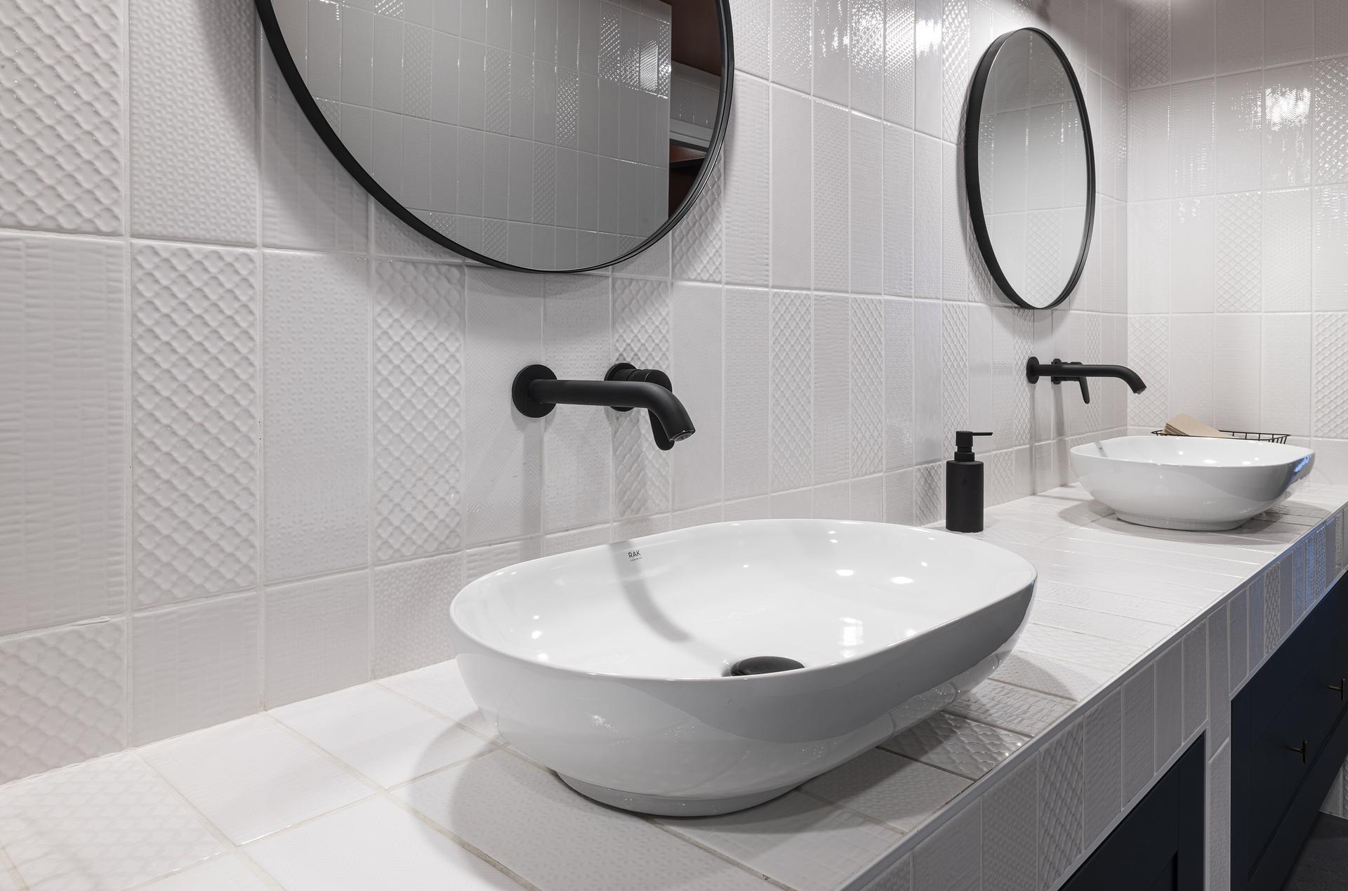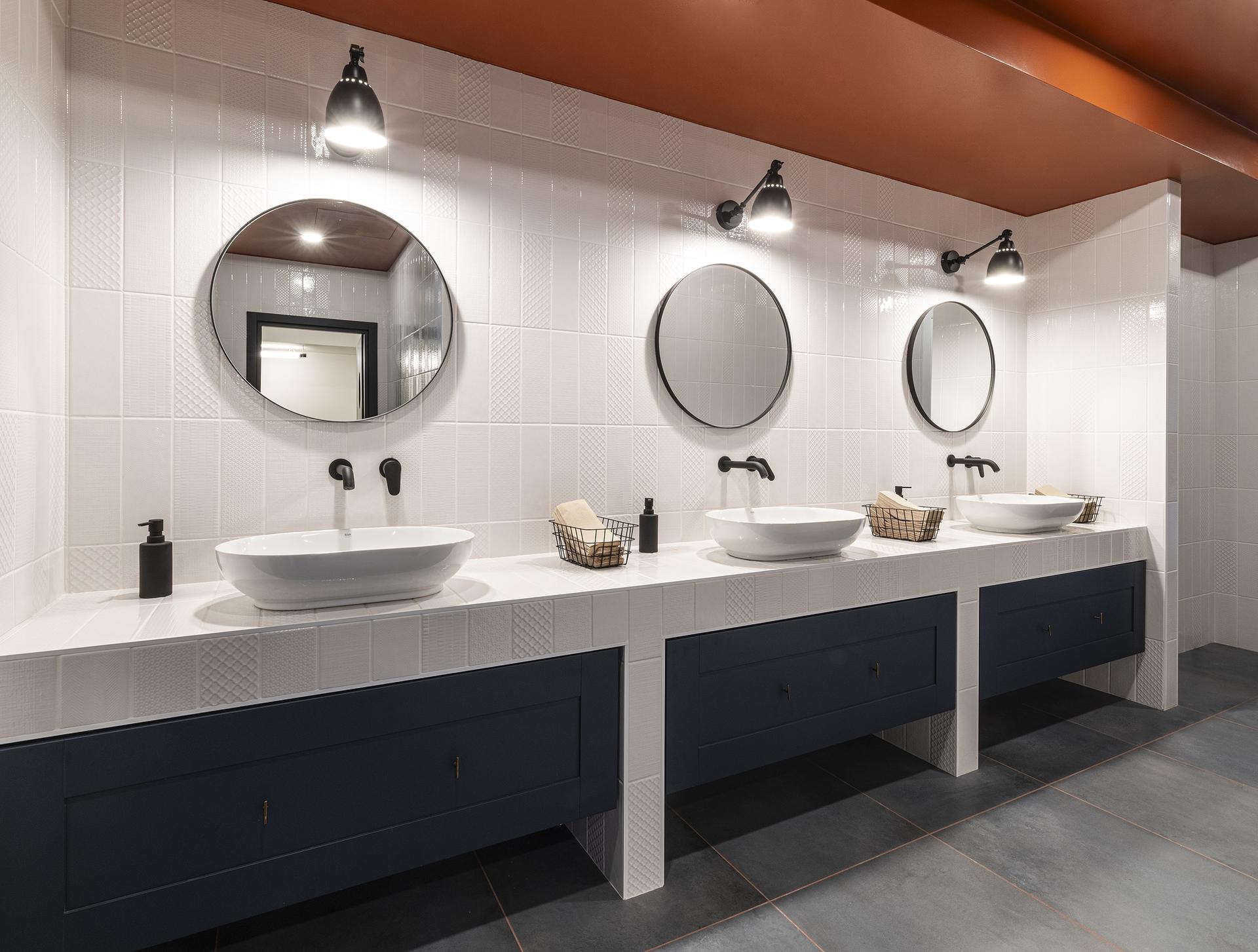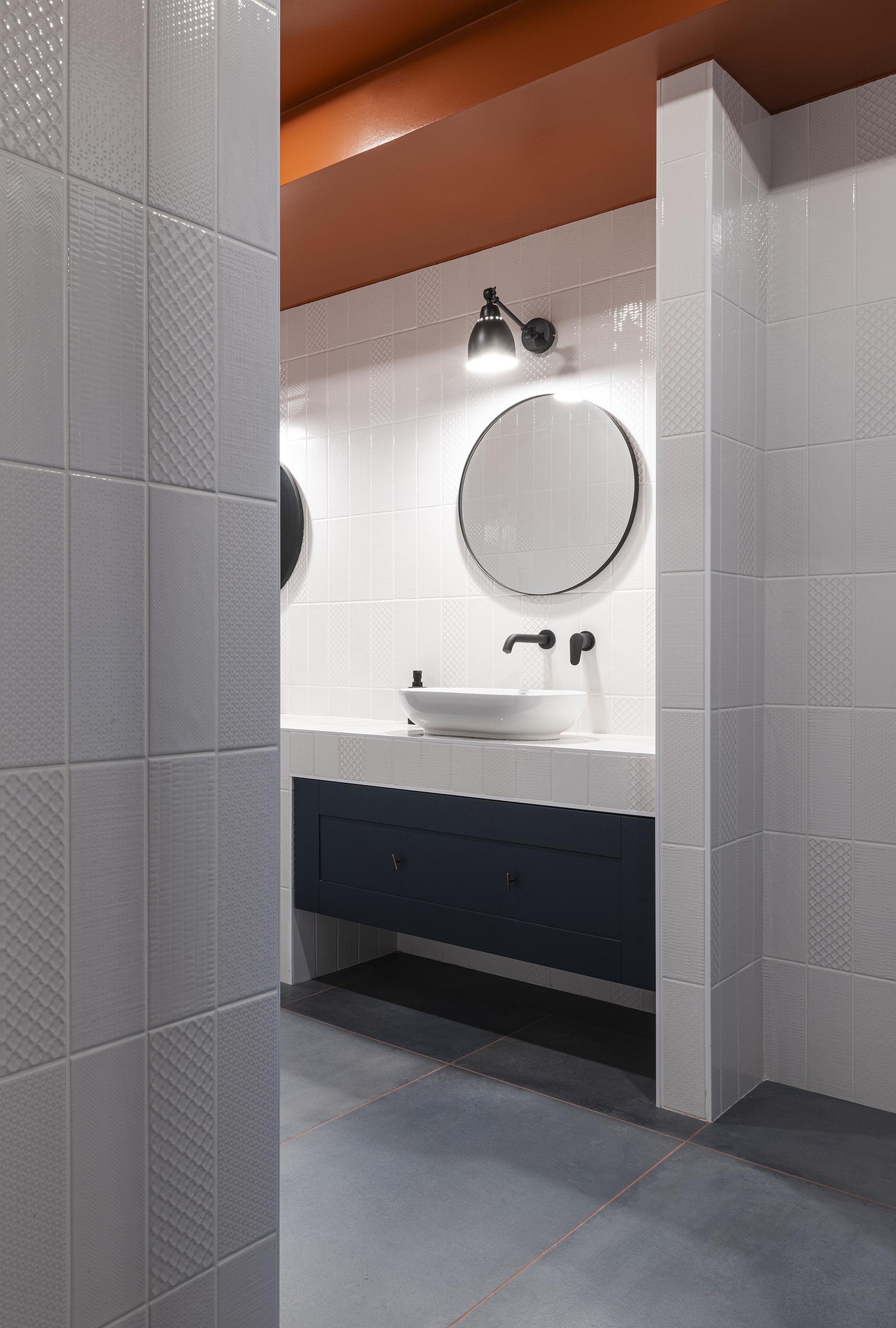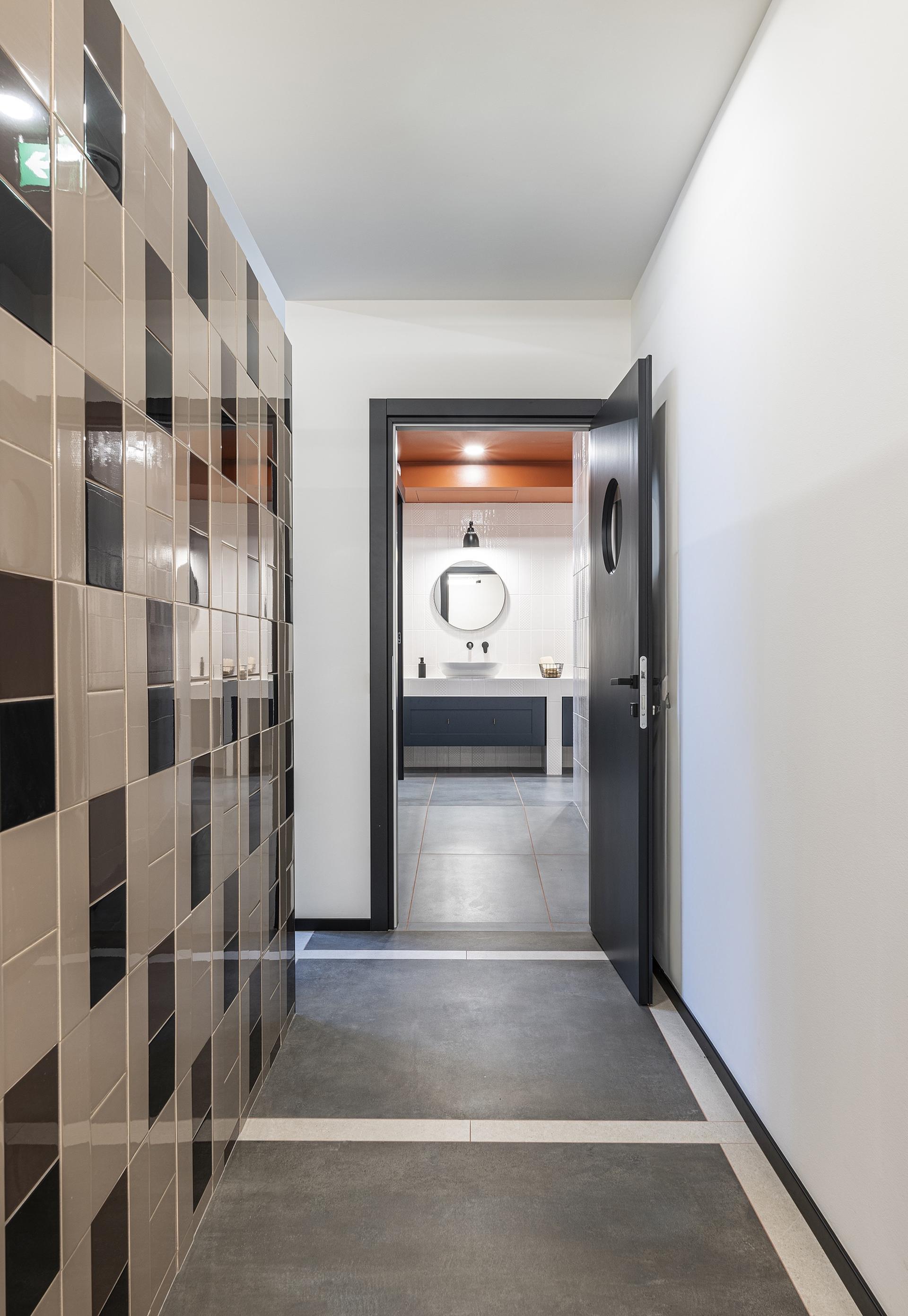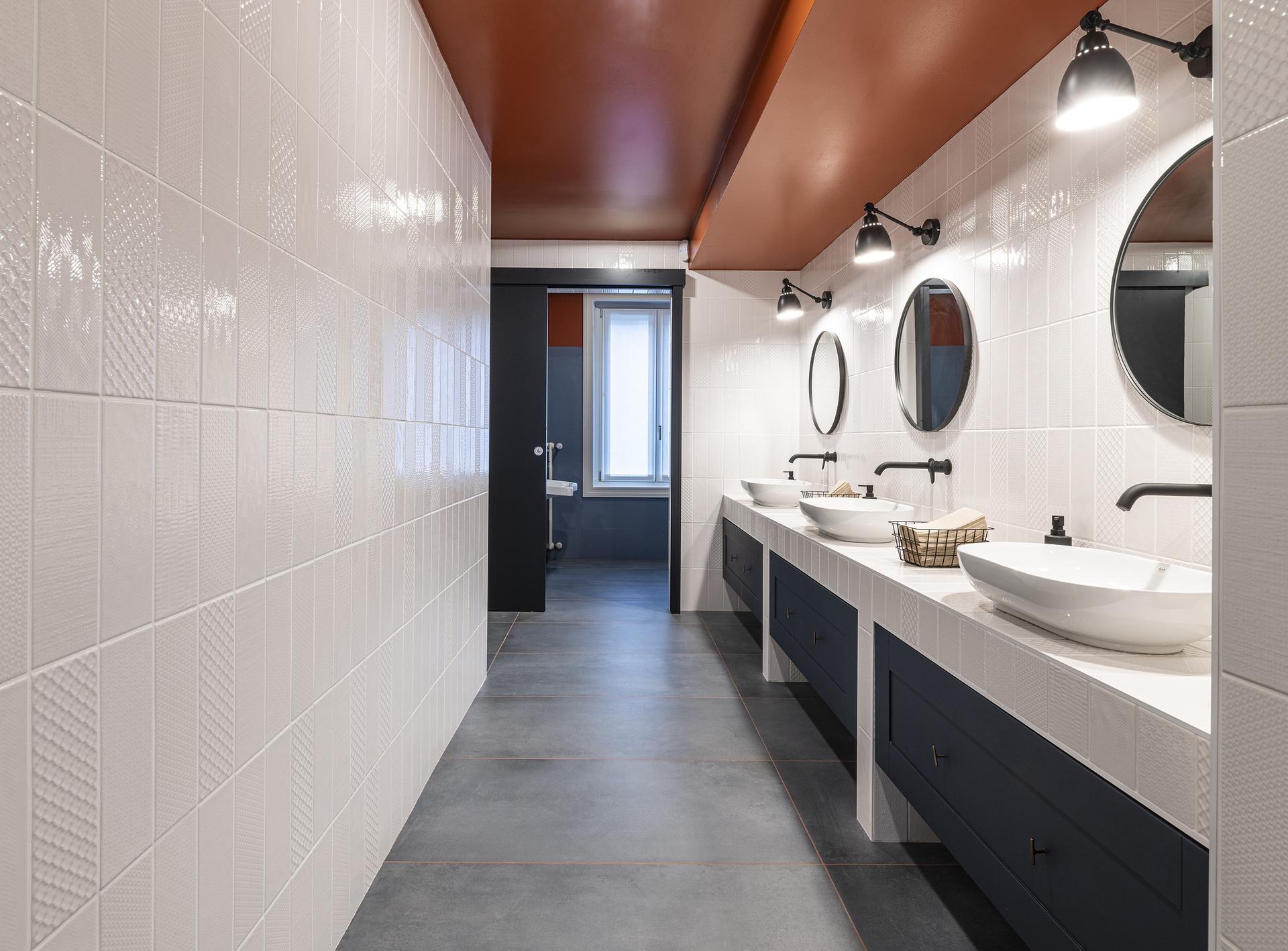 “Abbiamo optato per colori neutri e tonalità sobrie per promuovere una sensazione di calma e professionalità”, continua Bifulco a proposito di scelte cromatiche, “mentre alcune sfumature più vivaci sono state introdotte strategicamente per aggiungere dinamismo e vitalità agli ambienti”. Più in dettaglio, negli uffici della sede QuattroR è stata posata la serie Fresco di Ricchetti nella colorazione Burnt Umber, con fuga color arancio. Nei bagni, Fresco nella tonalità Blue Whale.