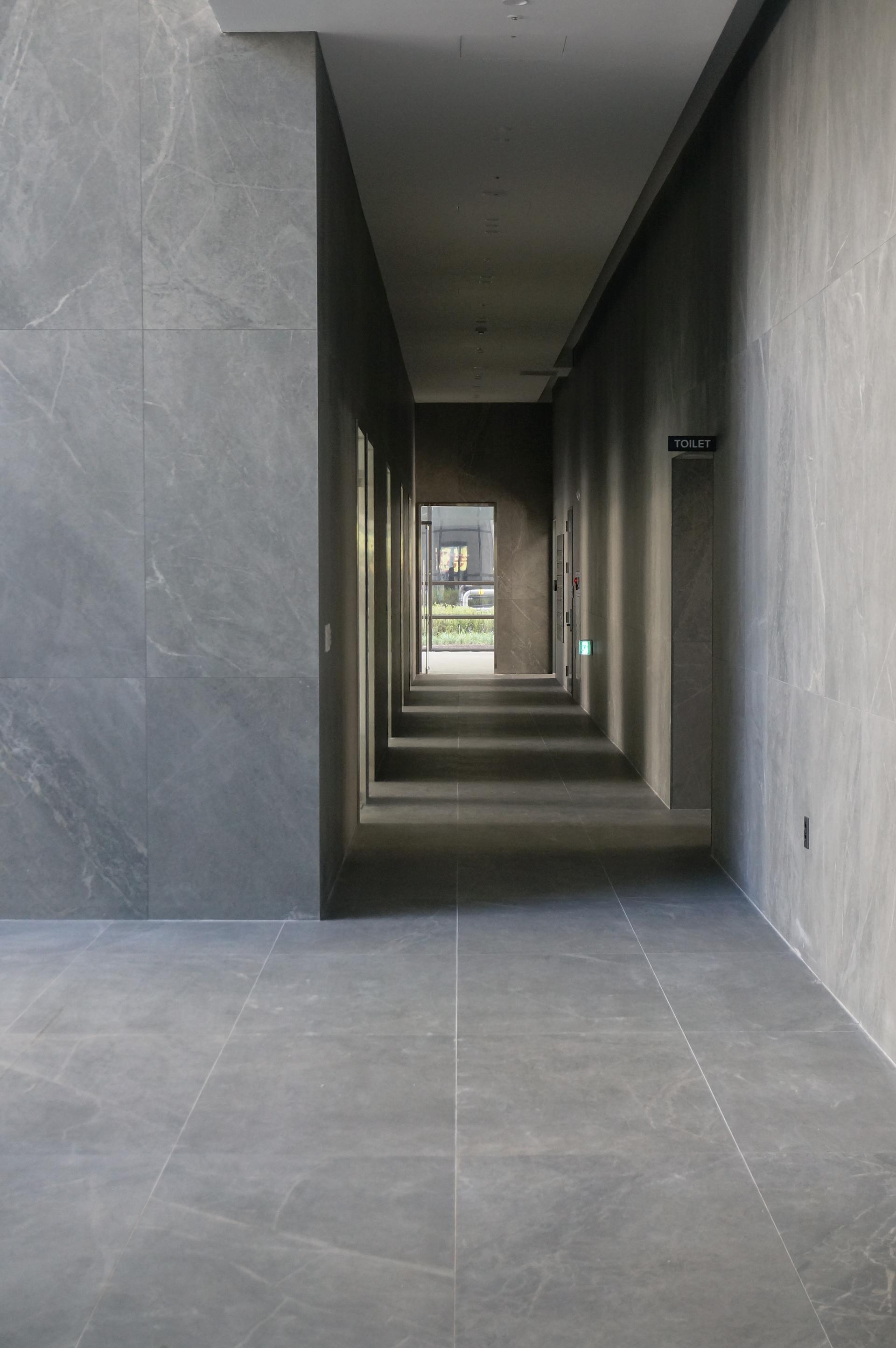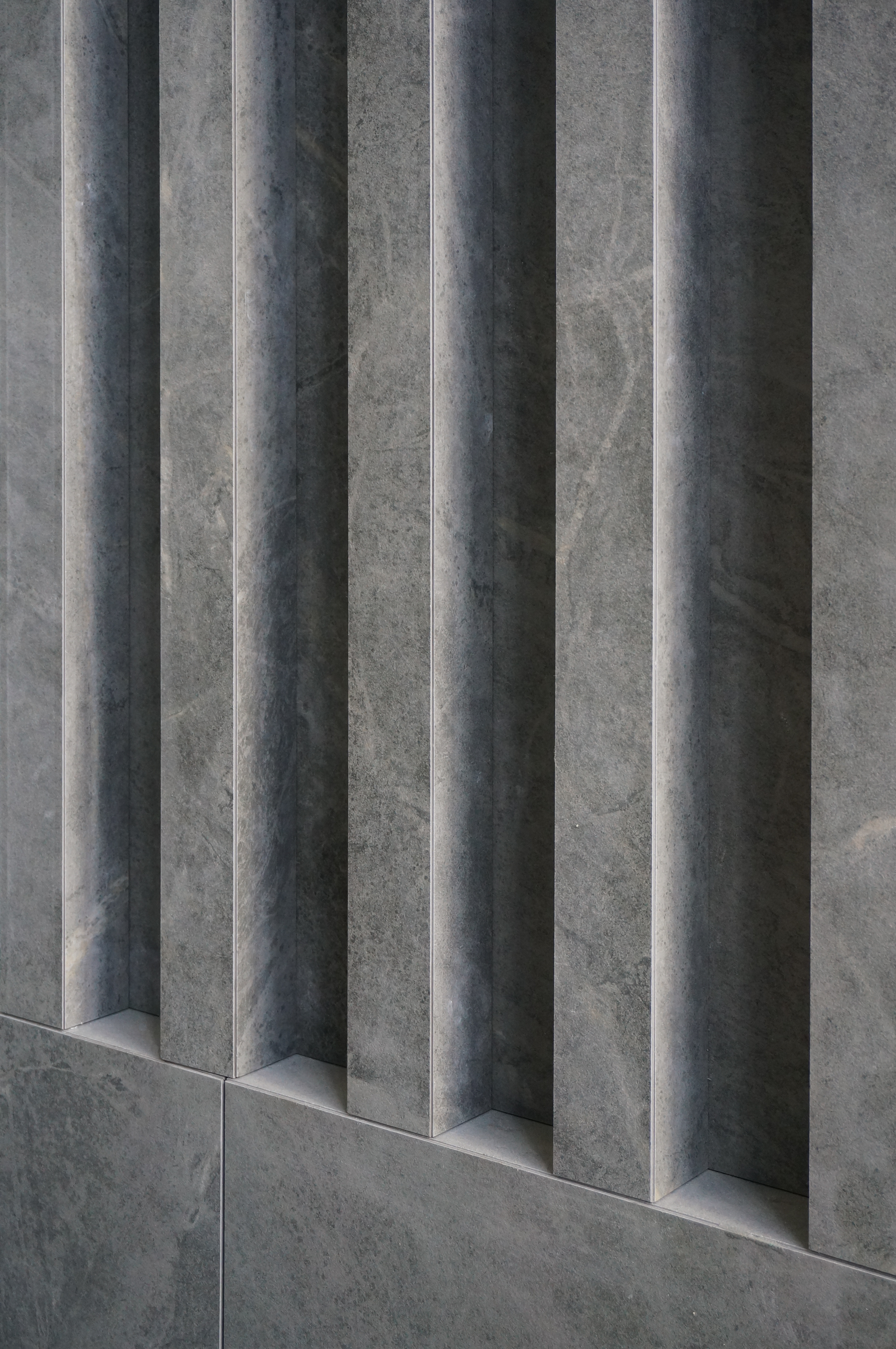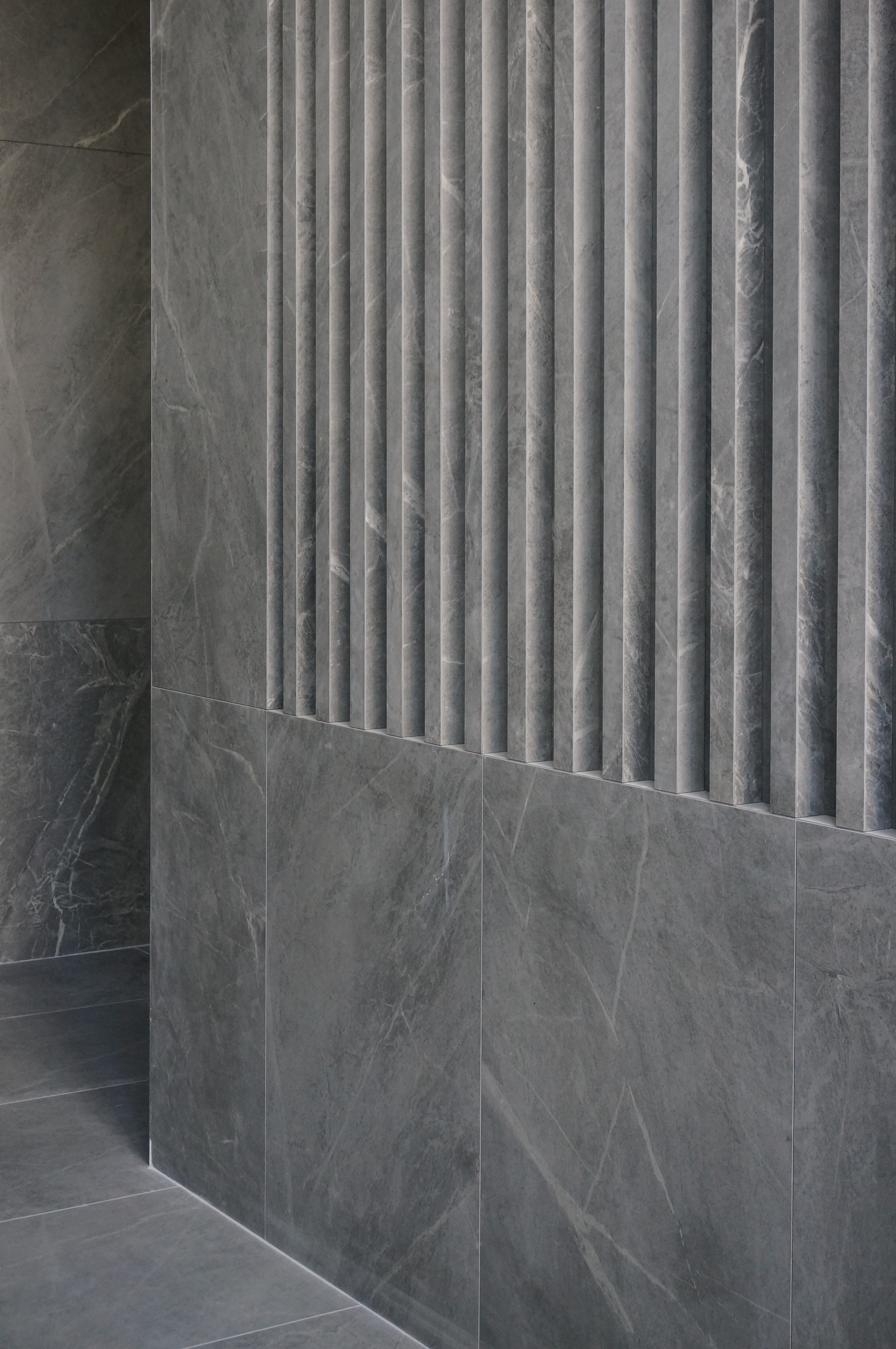 Il colore nero ha guidato anche le scelte dell’interior design: per i pavimenti e le pareti degli spazi comuni è stata scelta la collezione Soap Stone di COEM, nella versione Black.