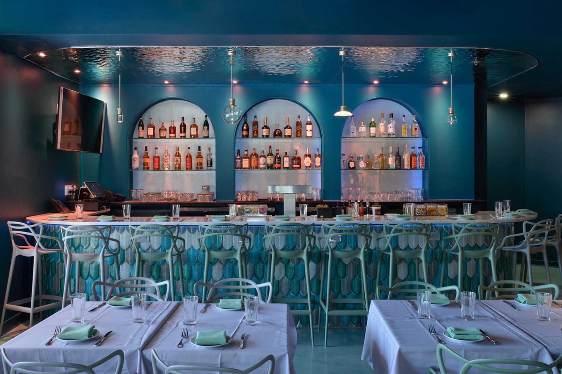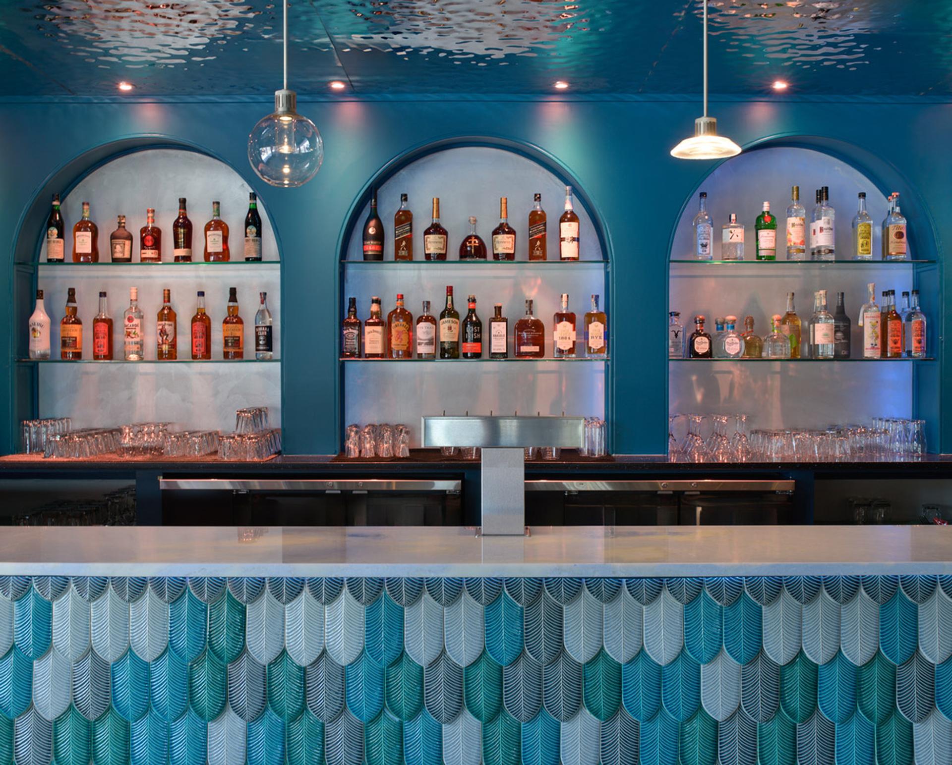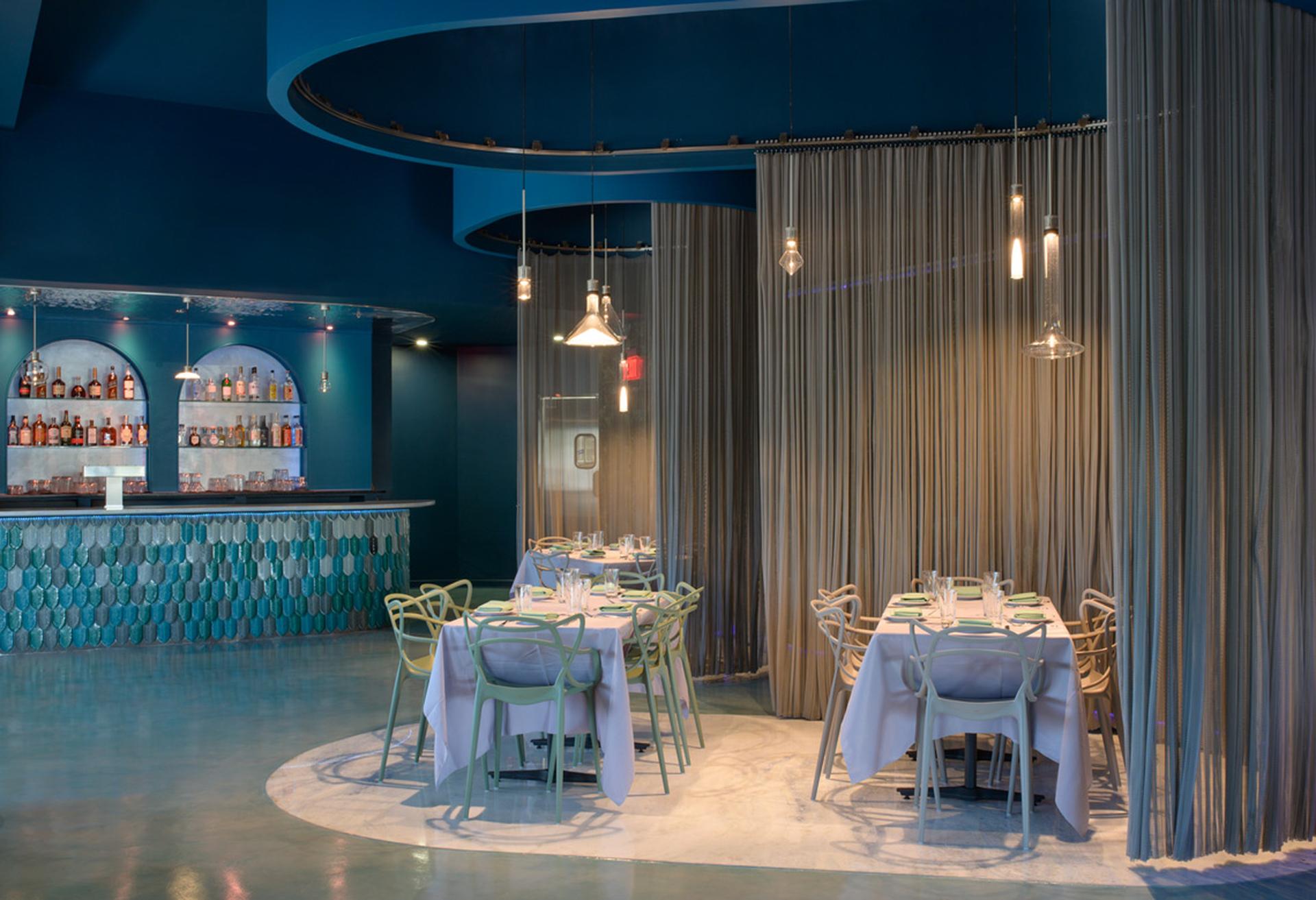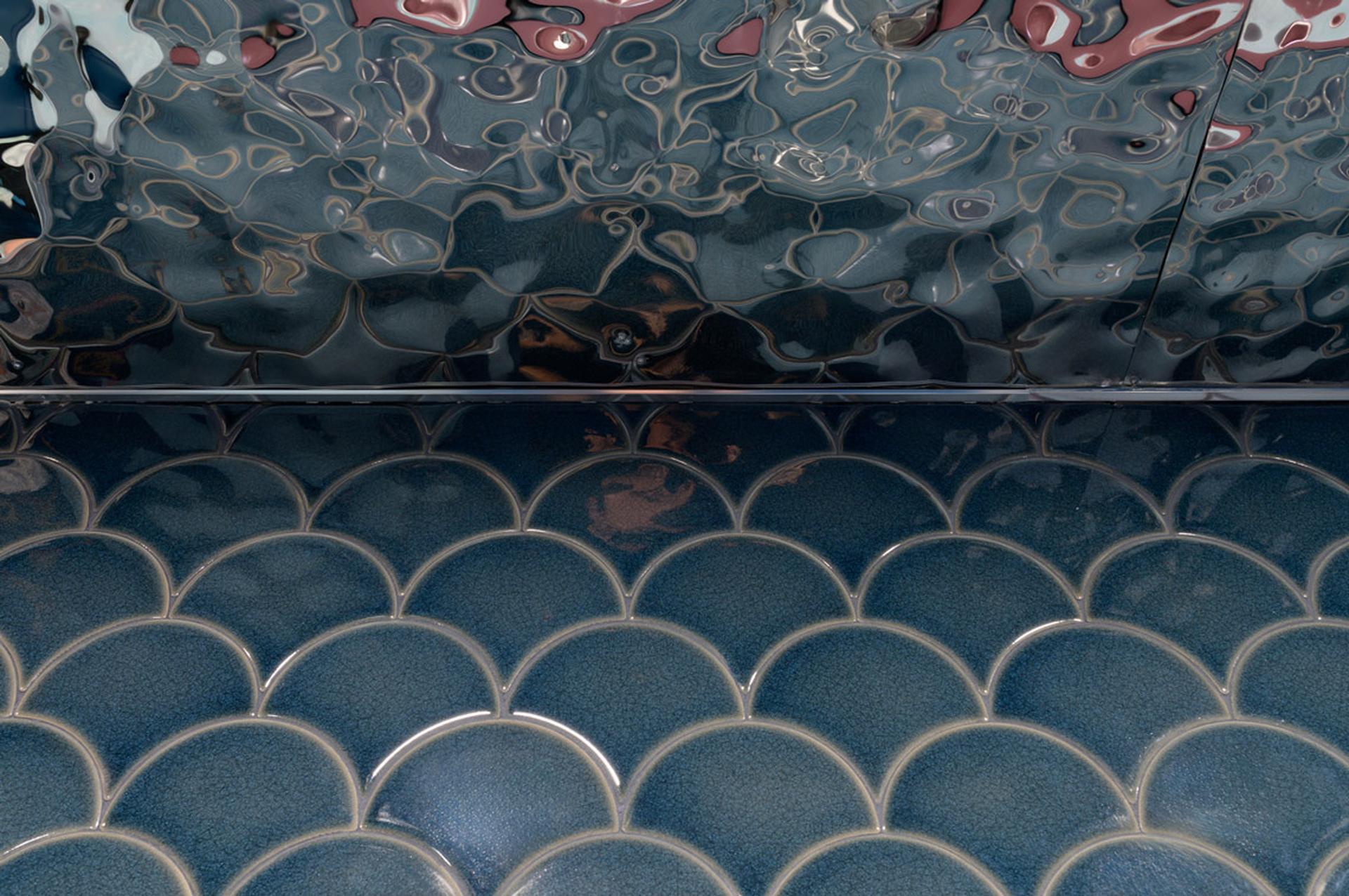 Punto focale è il bancone del bar, su cui lo sguardo immediatamente si posa. Quinta scenica e catalizzatore visivo con i tre archi in microcemento argentato e le mensole in vetro, sfrutta le piastrelle tridimensionali della collezione Calathea, pianta erbacea perenne, per un rivestimento dall’ispirazione organica in cui il verde e quattro diverse sfumature di blu creano una superficie viva e in continuo movimento, cambiando sotto i giochi della luce. A soffitto, un riuscito pannello di acciaio ondulato propone un affascinante effetto “superficie del mare”, dando un movimento che riflette il bancone in marmo Mediterranean Blue e scompone la luce e le forme.