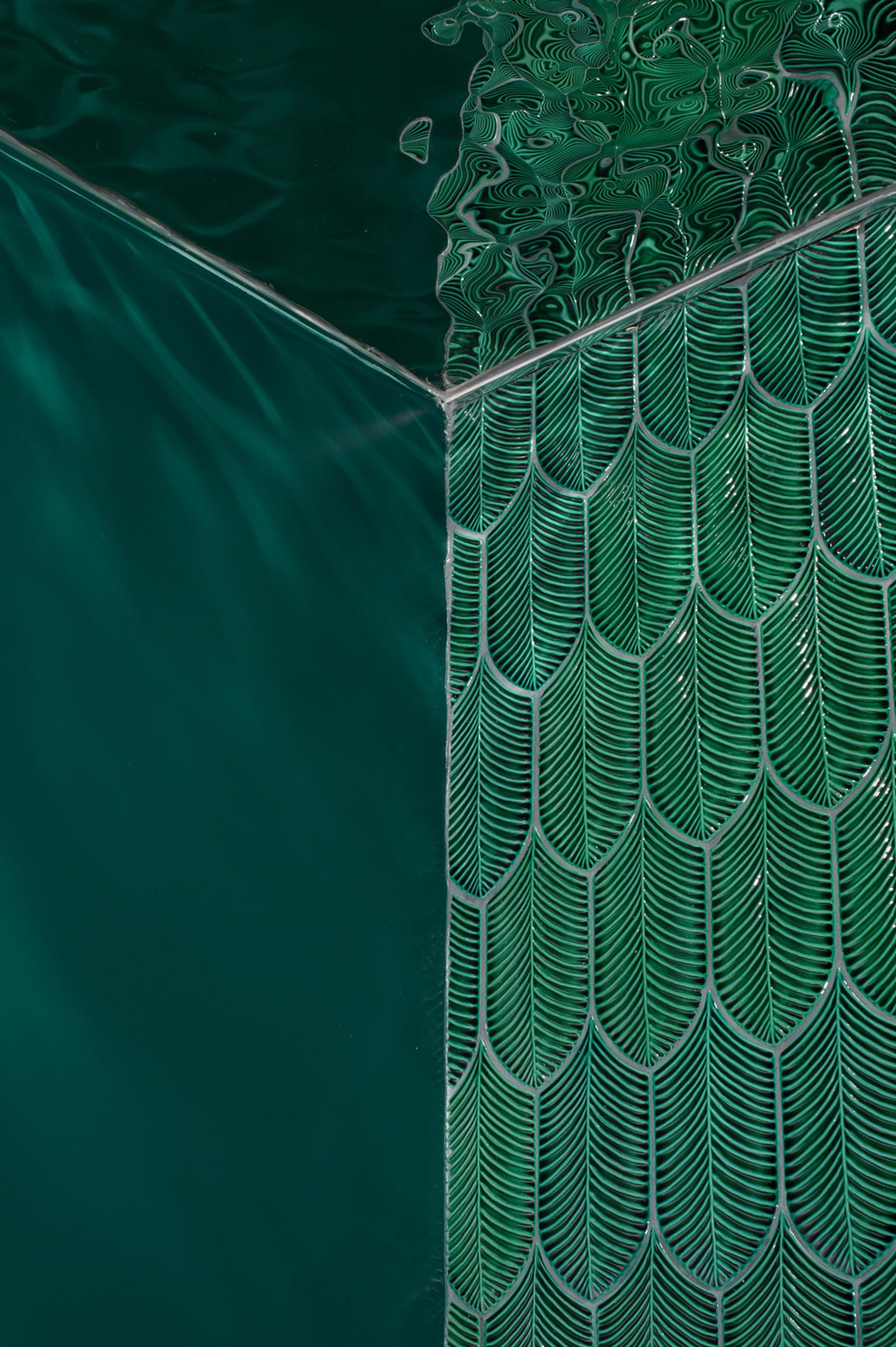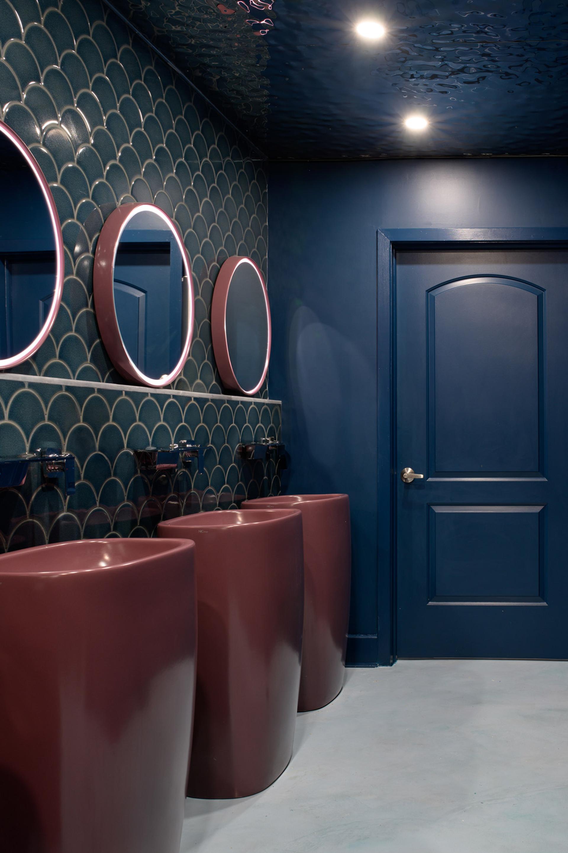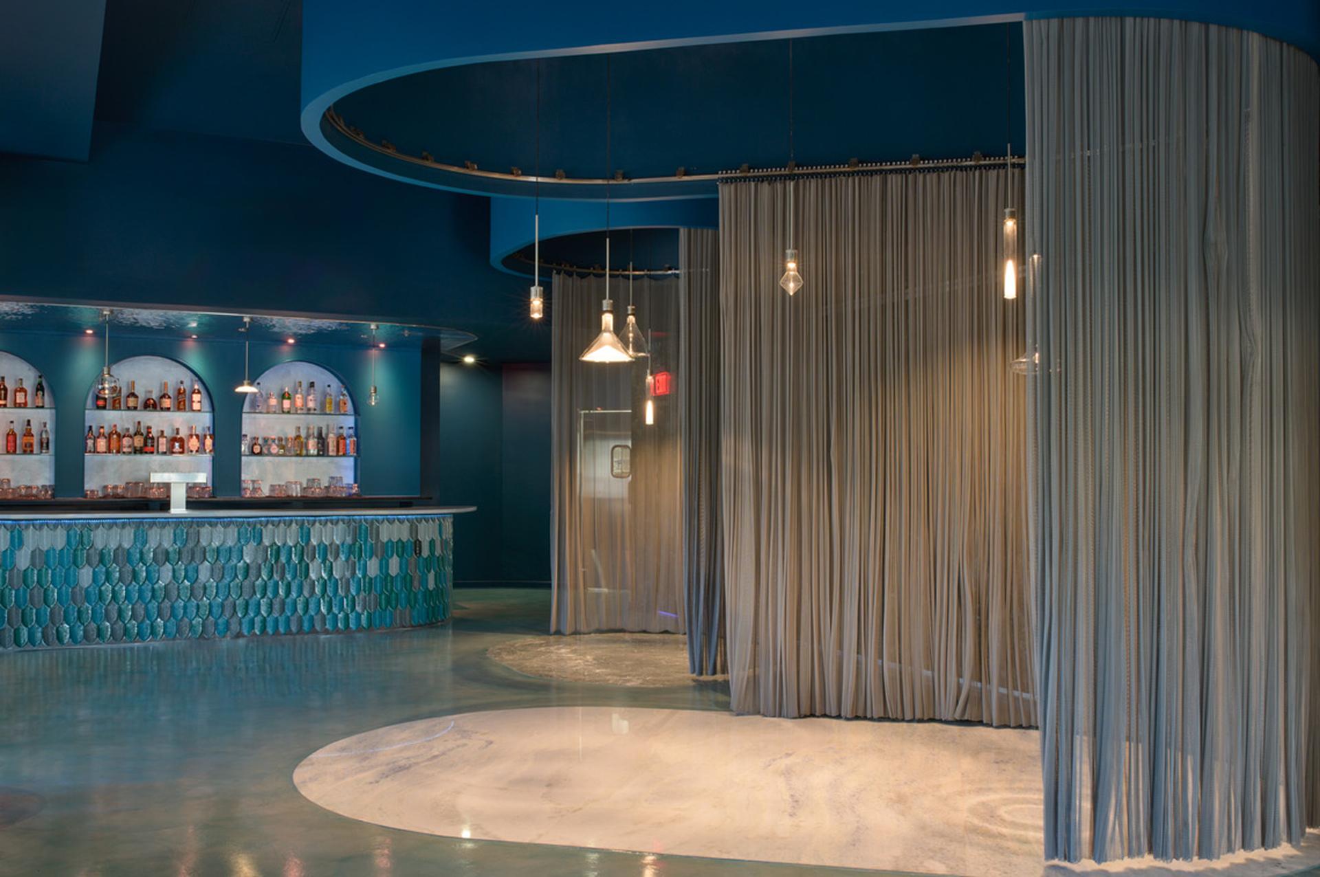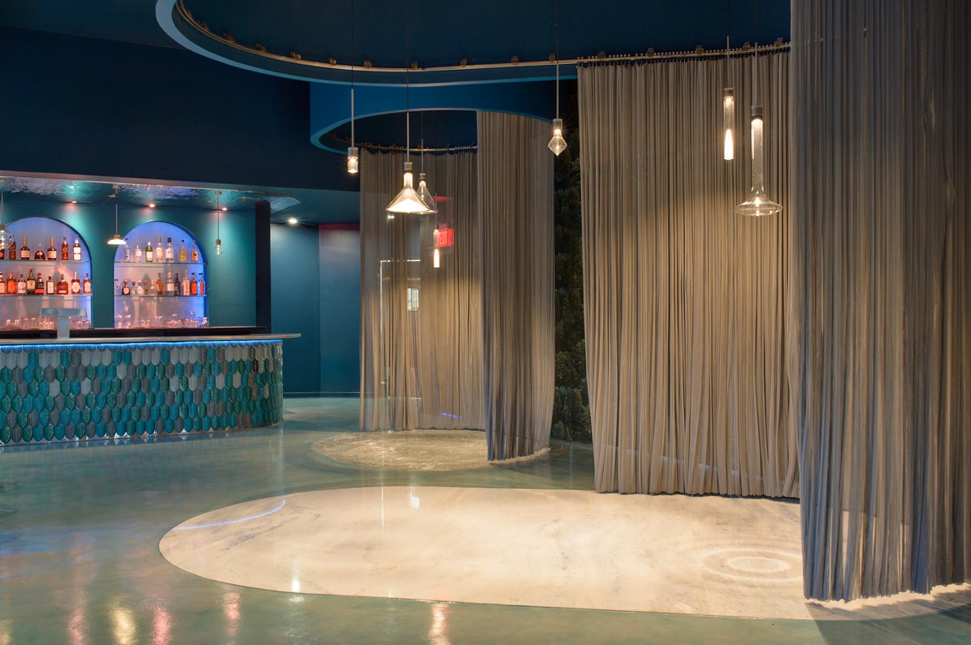 Punto focale è il bancone del bar, su cui lo sguardo immediatamente si posa. Quinta scenica e catalizzatore visivo con i tre archi in microcemento argentato e le mensole in vetro, sfrutta le piastrelle tridimensionali della collezione Calathea, pianta erbacea perenne, per un rivestimento dall’ispirazione organica in cui il verde e quattro diverse sfumature di blu creano una superficie viva e in continuo movimento, cambiando sotto i giochi della luce. A soffitto, un riuscito pannello di acciaio ondulato propone un affascinante effetto “superficie del mare”, dando un movimento che riflette il bancone in marmo Mediterranean Blue e scompone la luce e le forme.