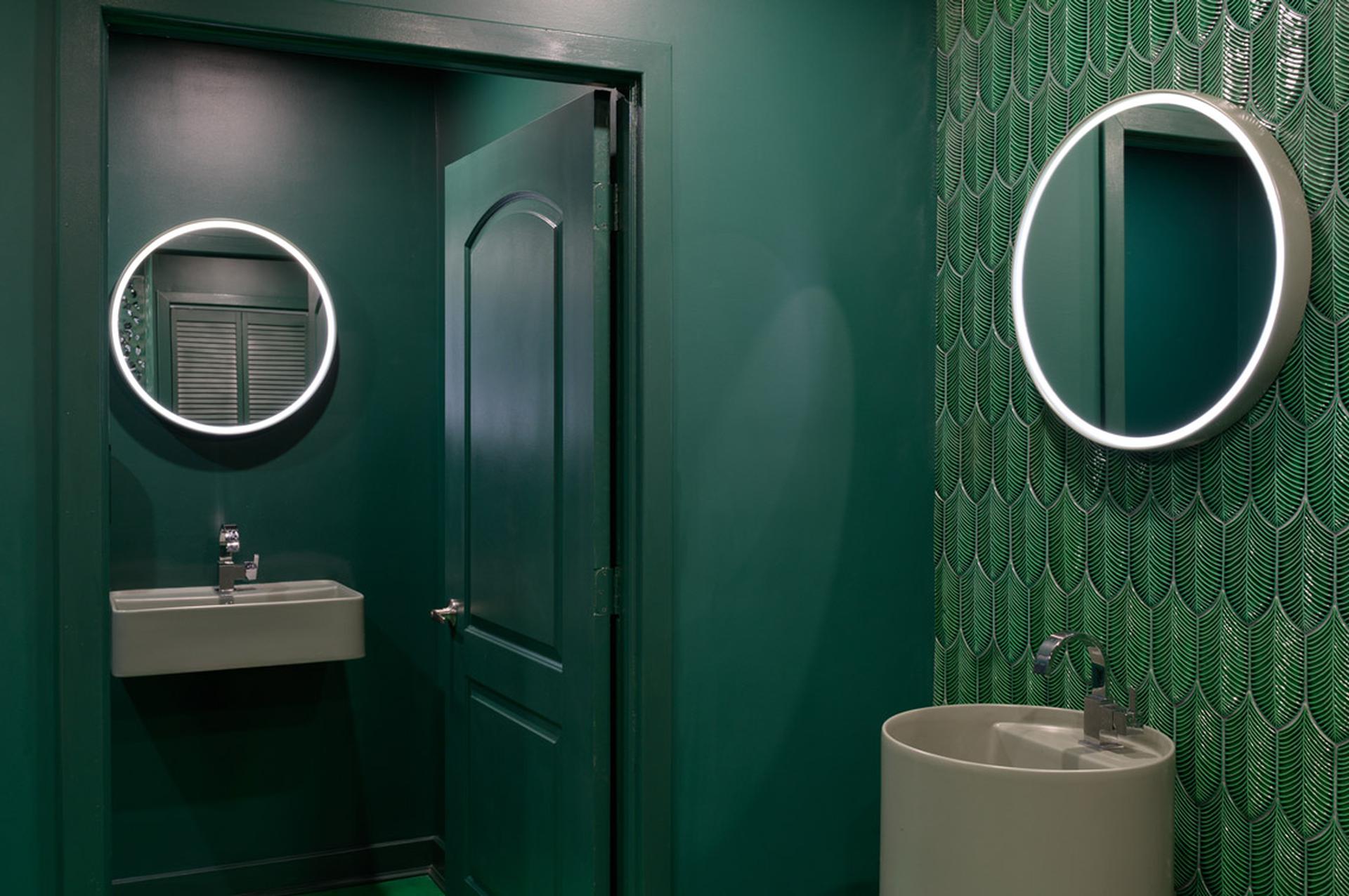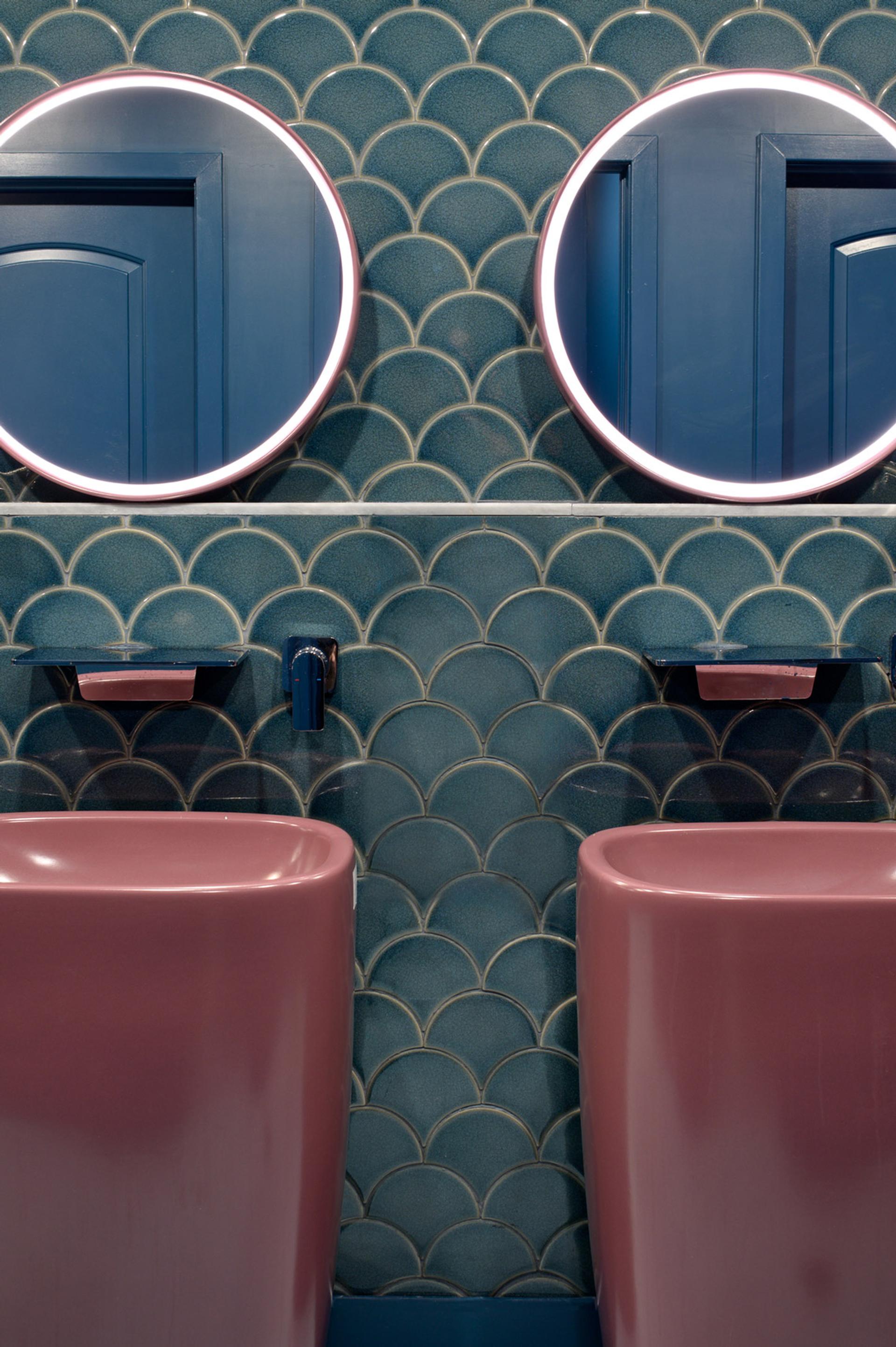 La coerenza materica e formale del progetto di interior si estende anche agli spazi di servizio, non secondari. In questo contesto fluido, la ceramica si dimostra una materia flessibile, in grado di dialogare con funzioni e atmosfere mantenendo coerenza formale anche nei bagni, dove il progetto realizza nuove camere tematiche legate al mondo vegetale e marino. Calathea, declinata in verde, si affianca qui alla collezione Pavoncella con le sue tonalità blu profondo che, accostate ai sanitari color corallo, crea un nuovo ambiente sospeso tra realtà e immaginazione.