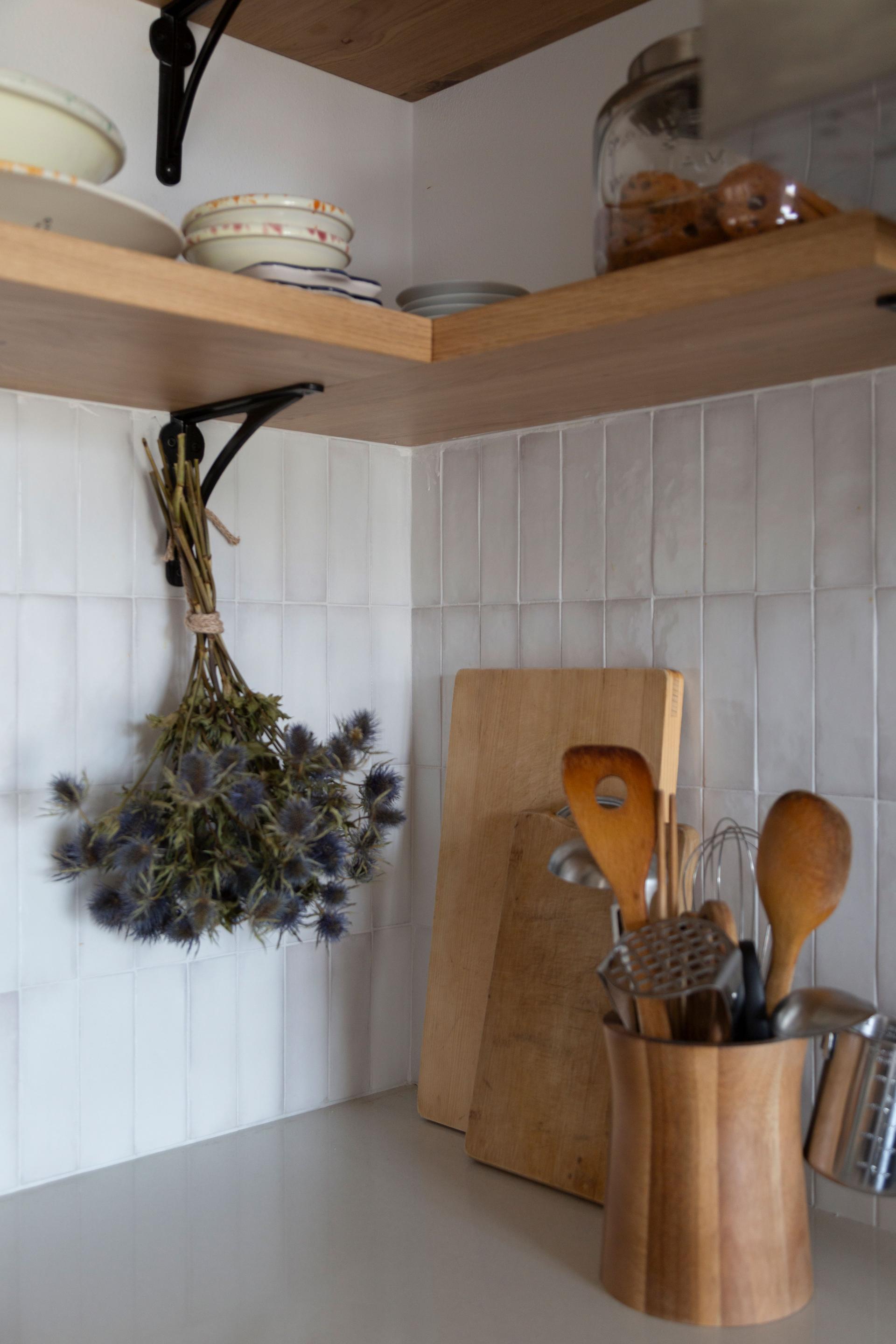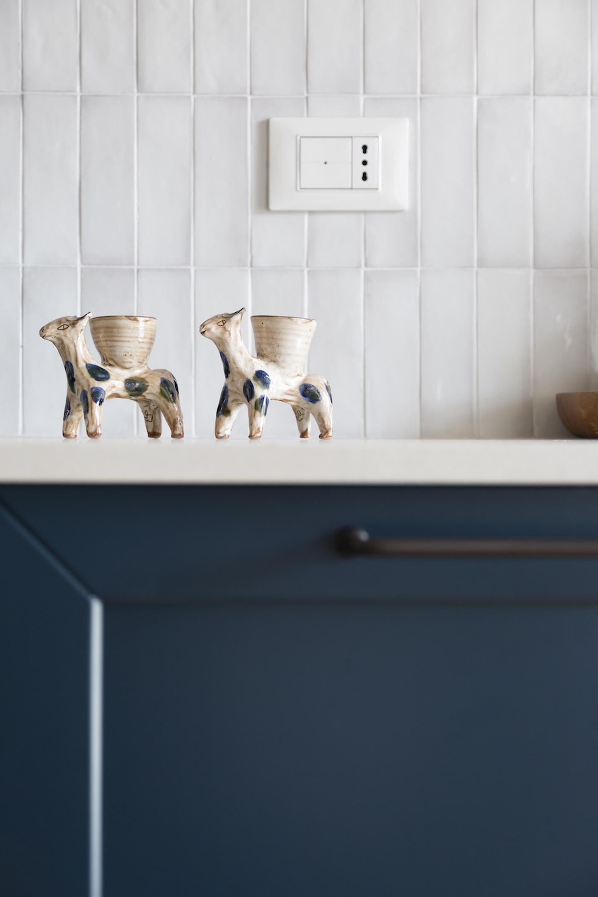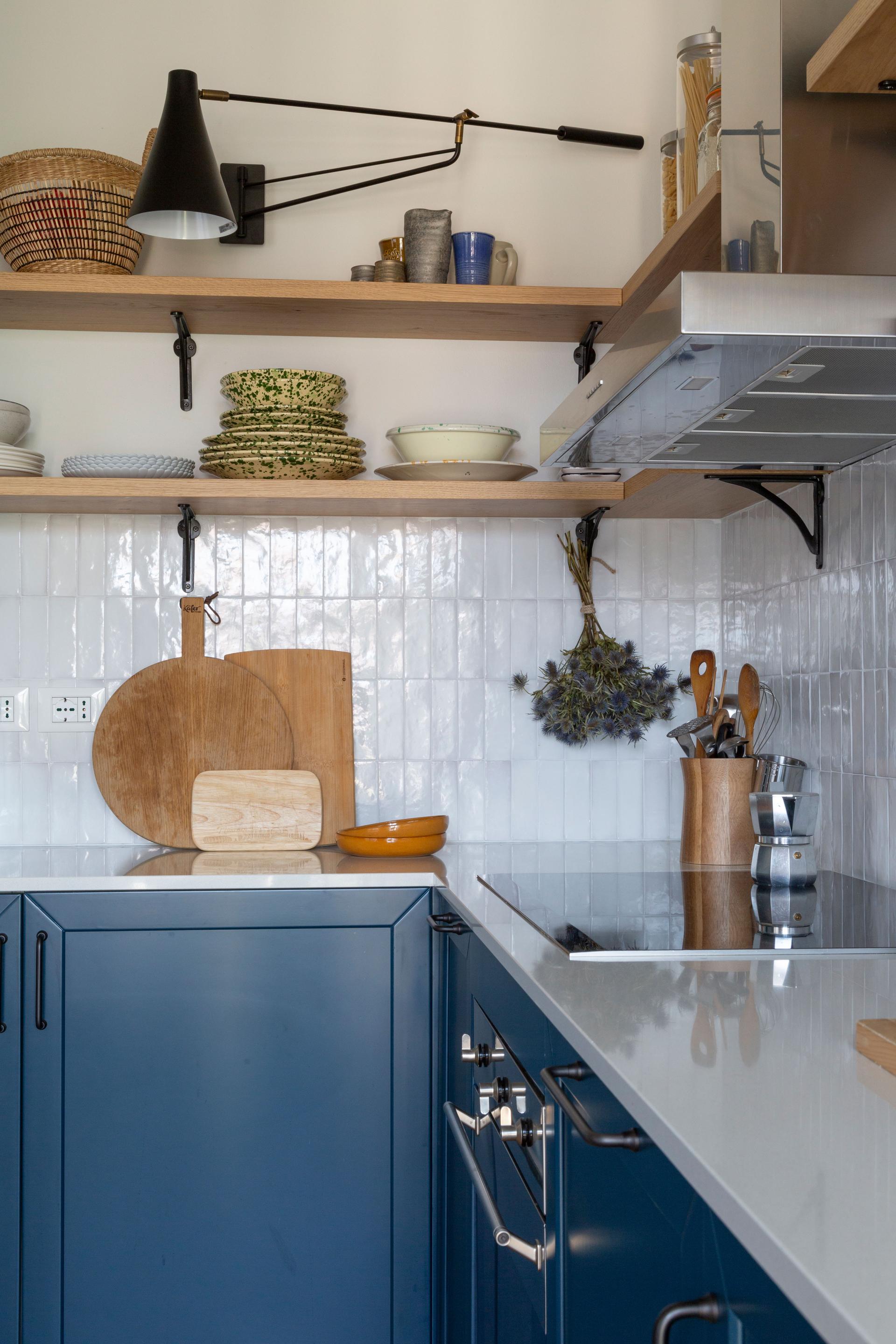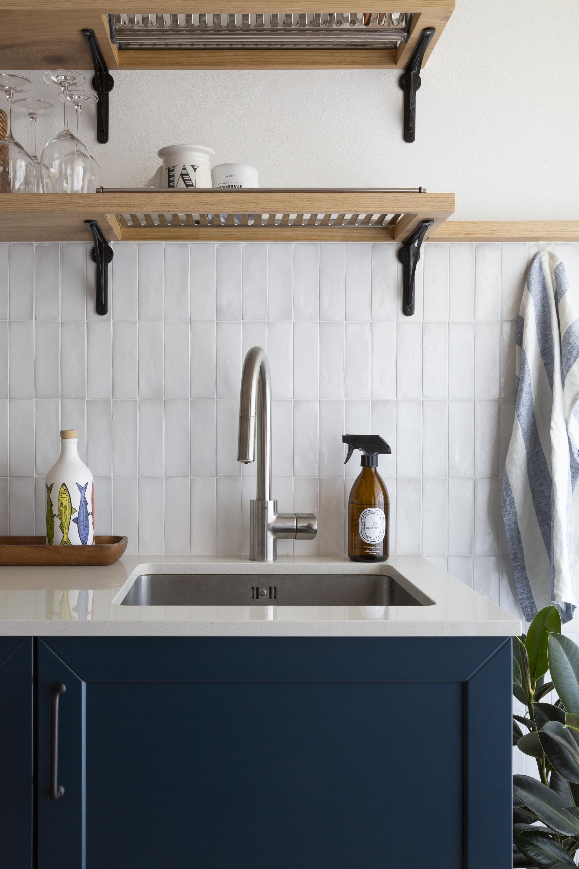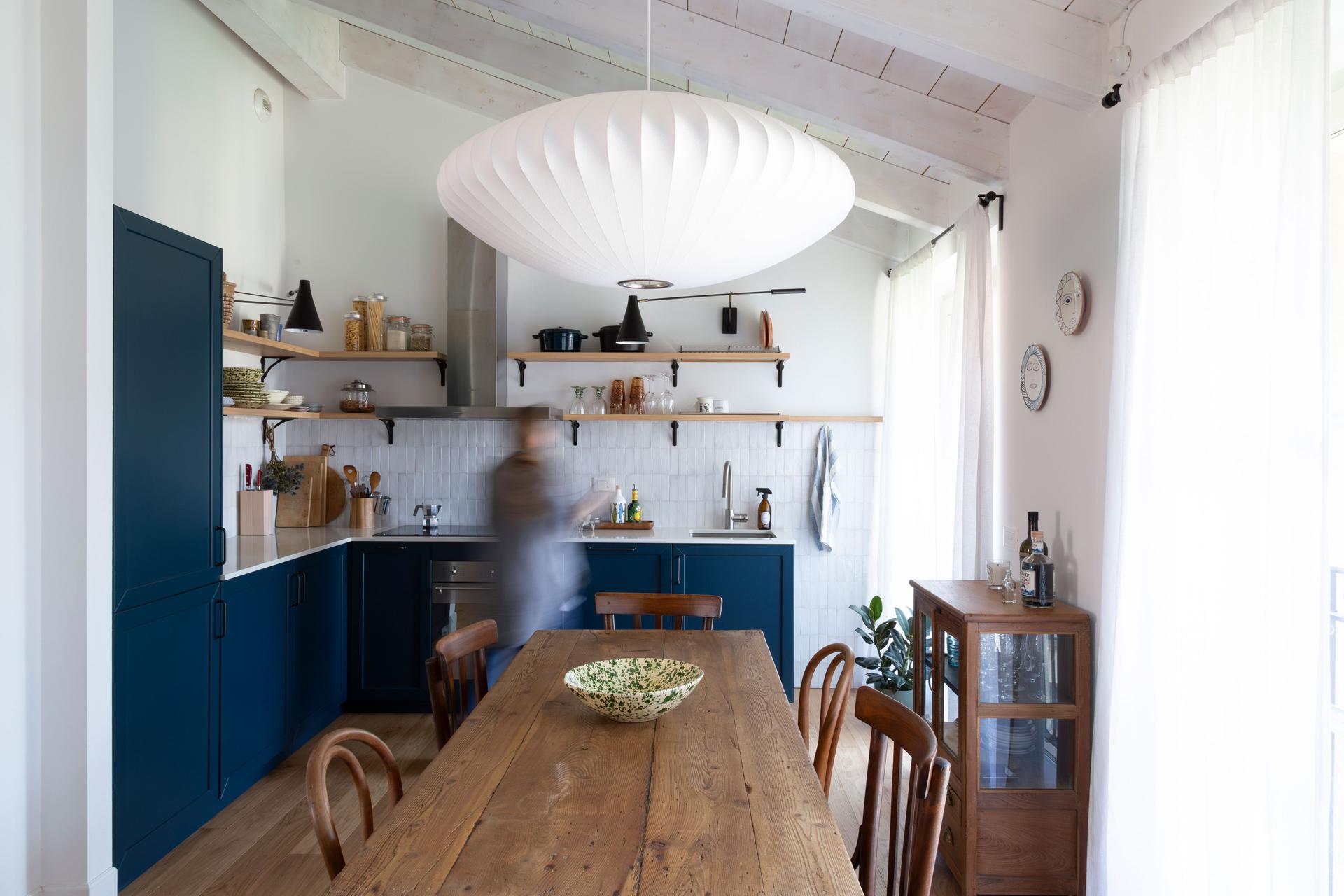 Proprio la cucina, con le sue ante blu intenso e le mensole a vista al posto dei pensili, è diventata uno degli ambienti più distintivi della casa: “Abbiamo sostituito le ante della cucina con delle ante di stile più rustico di un blu intenso e i pensili con delle mensole a vista. Cercavamo, poi, delle piastrelle di formato piccolo che creassero un contrasto, ma che fossero di un colore neutro e capaci di dare l’idea di piastrelle fatta a mano, un po’ irregolari e abbiamo così proposto la collezione Senren di Tonalite, con una posa verticale per dare loro un tocco un po’ più contemporaneo.” La posa “stack” verticale ha, infatti, enfatizzato l’effetto moderno del rivestimento, dialogando in armonia con il carattere rustico della cucina.
