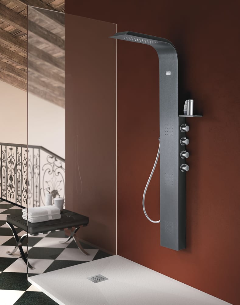 09. Душевая стойка Lama от компании Geromin с лаконичным дизайном покрыта материалом Alulife®, изготовленным из 100-процентного рекуперированного алюминия. Эта обработка, разработанная благодаря инновационным технологиям, придает металлу особую текстуру, сложную, переливающуюся, красивую на вид и тактильно приятную.