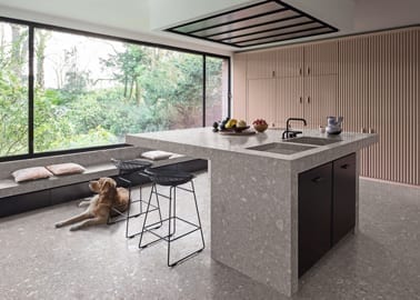 В жилых пространствах находят свое применение плиты увеличенной толщины, от 20 мм и более, используемые для ступеней и в качестве отделочного материала на террасах, в садах, наружных дорожках и в зеленой зоне, или как рабочие поверхности для барных стоек и кухонных столешниц. Таким же образом плиты уменьшенной толщины, до 3 мм, используются как облицовка функциональных и рабочих поверхностей столов и мебели, а также как техническая и эстетическая отделка дверей, стен и архитектурных объемов, не забывая при этом о напольной укладке в проектах по реконструкции, при которой эти материалы представляют собой весьма интересные и экономичные решения, особенно если они укладываются на уже существующий пол, что исключает расходы по разборке старого покрытия. Опять же для интерьерного дизайна были разработаны модульные продукты и системы, которые характеризуются трехмерной рельефной отделкой поверхности и тактильной текстурой, позволяющими персонализировать помещения дома, подчеркивая с их помощью лишь отдельные элементы, как например стена, конкретный объем, выступ, пилястра, колонна, неправильная поверхность, дверной проем, облицовка камина…