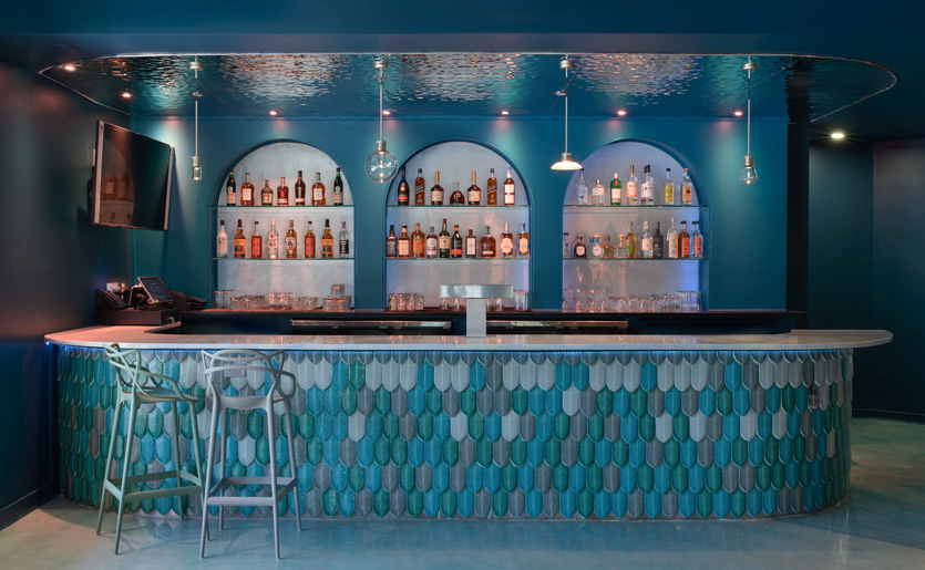 Tikka Charcoal Grill от архитектурной студии Olbos studio оживляет сенсорный подводный мир благодаря иммерсивному дизайну и яркой материальности. Центральным элементом ресторана является скульптурная барная стойка, облицованная перекрывающимися трехмерными плитками из линии Calathea от AcquarioDue, повторяющими движение воды в четырех оттенках синего океана. По всему пространству, тону и формам, вдохновленным морским миром, выделяются обеденные зоны, заключенные в пространства, ограниченные четырьмя столбообразными потолками, которые мерцают, как фонари за полупрозрачными занавесками, и отражаются в поверхности пола. В ванных комнатах плитка AcquarioDue снова задает смелый тон: от персиковых и теплых золотистых оттенков до темно-синей плитки в сочетании с раковинами кораллового цвета. Каждое тщательно продуманное пространство продолжает водный сюжет, который подчеркивают волнистые металлические панели на потолках ванных комнат.