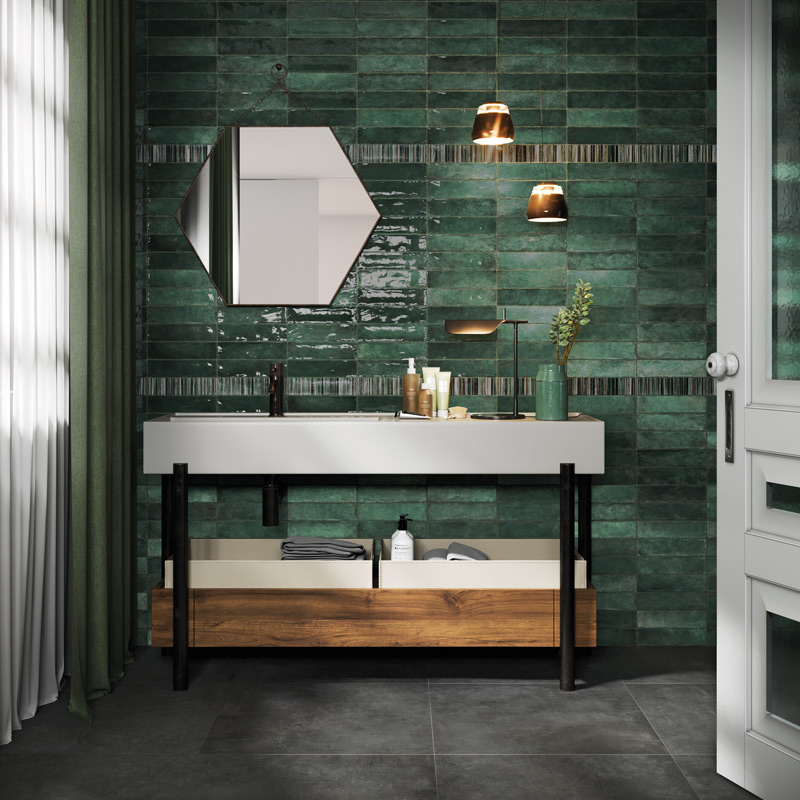 Оставаясь в теме стилистических тенденций, отметим еще одно решение, предлагаемое дизайнерами для отделки плитки и керамогранита, оно состоит в нанесении графического рисунка или в специальной обработке, которые создают на поверхности трехмерные объемы. Это достигается за счет геометрии и хроматических приемов, а также видов обработки поверхности, создающих рельефность, способную отражать свет и рождать иллюзию 3D.