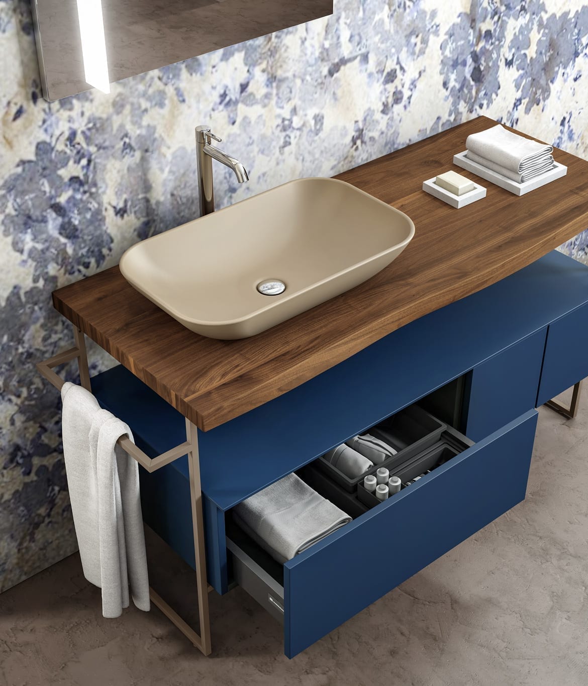Мебельная серия для раковины Mobilduenne характеризуется яркими оттенками в сочетании с деревом. Версия 713 (на фото) в матовой версии темно синего цвета имеет столешницу из массива ореховой древесины, накладную раковину из матовой керамики бежевого цвета и металлическими аксессуарами.