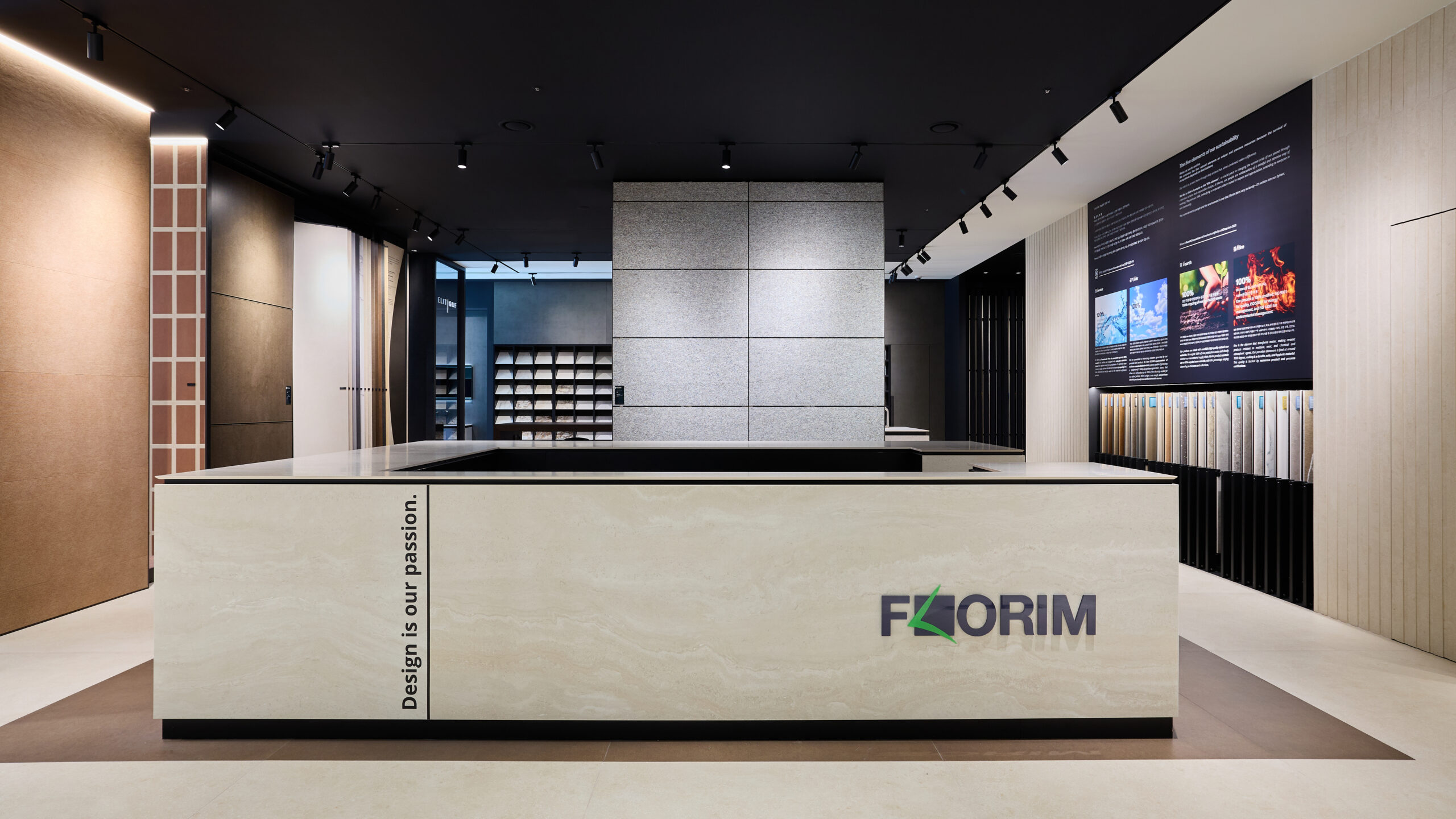 В больших витринах здания, расположенного на Хакдон-ро 231, выставлены крупноформатные керамические плиты толщиной от 3 до 20 мм для облицовки стен, мебели и вентилируемых фасадов. Экспозиция включает рабочие зоны и примеры оформления керамикой различных пространств, включая функциональную кухню, изысканную ванную комнату под брендом Elitique, разработанную Florim в сотрудничестве с Falper, а также площадку, посвященную более сложным техническим применениям.